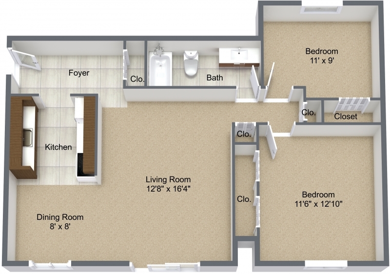 2 Beds, 1 Bath, 825 sq ftAvailable NowModel Gallery