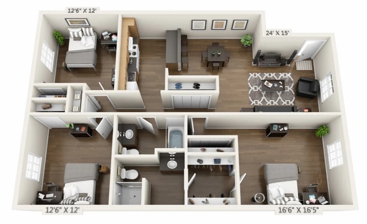 Apartment Model: 2x2From $1,2592 Bedroom, 2 Bath, 1000 sq ftUnavailable![]()