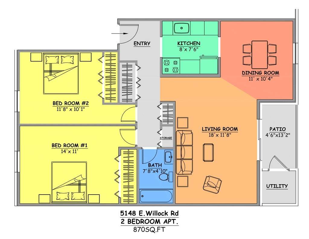 2 Beds, 1 Bath, 870 sq ftModel Gallery