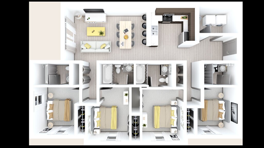 Apartment Model: 4x4 Furnished - ApartmentFrom $9004 Bedroom, 4 Bath, 1355 sq ftAvailable Now![]()