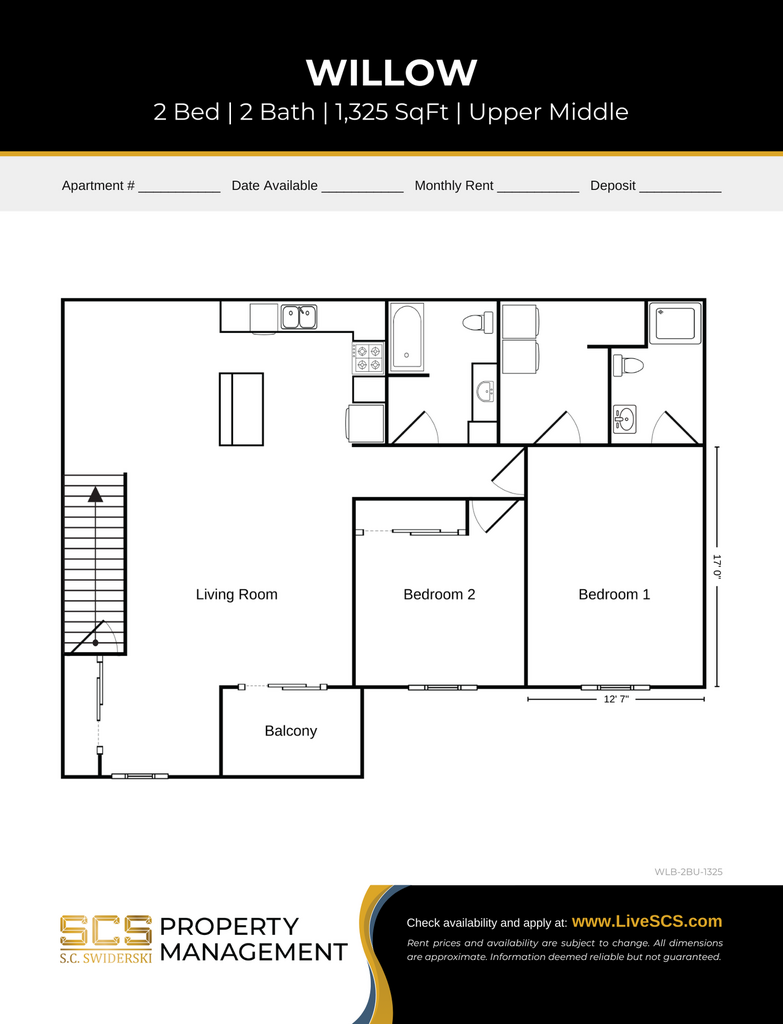 Apartment Model: Willow 2 BR 2 B Upper$1,3602 Bedroom, 2 Bath, 1325 sq ftAvailable November 1, 2025FloorplansPhotos![]()