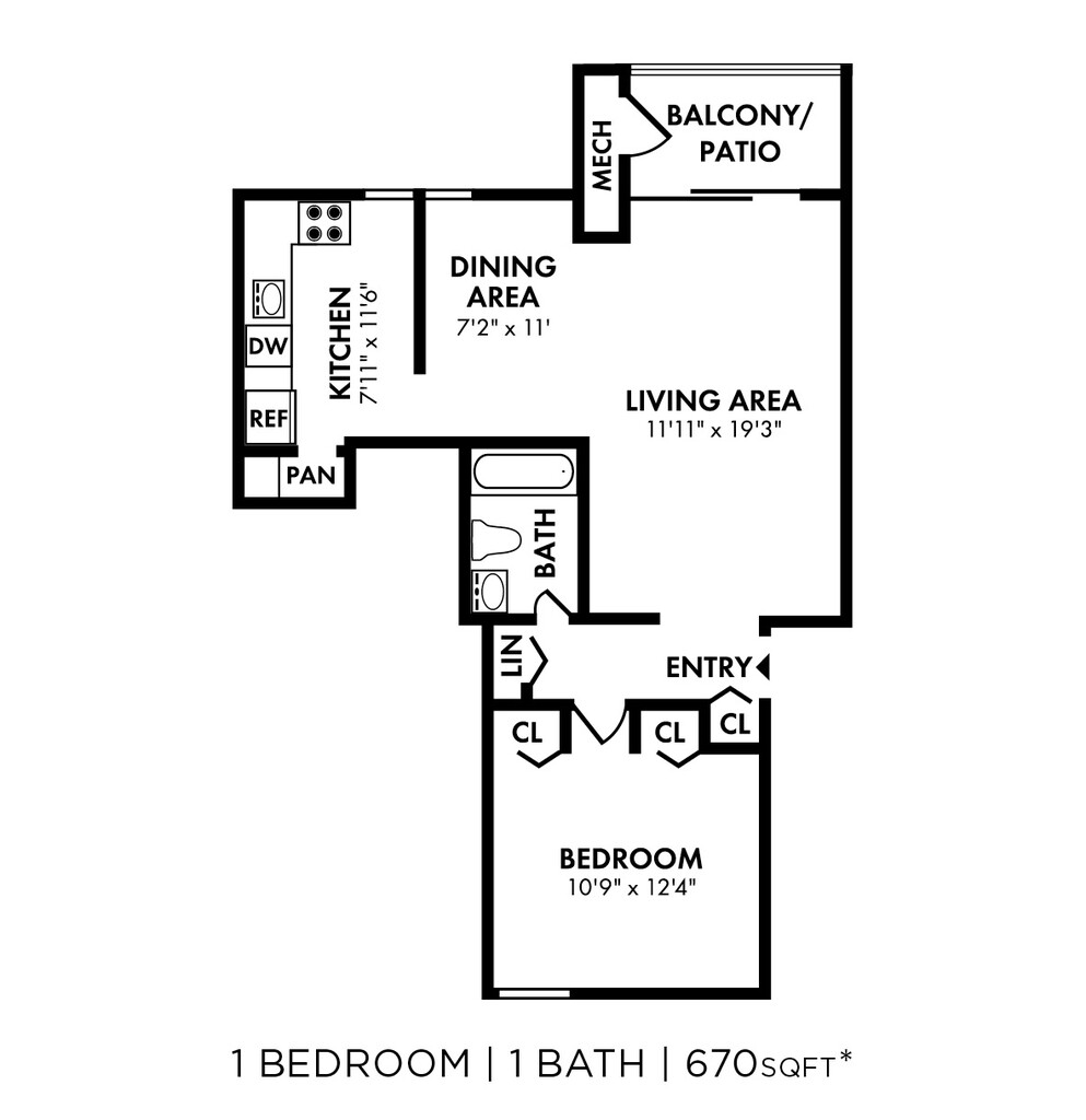 1 Bed, 1 Bath, 670 sq ftAvailable NowModel Gallery