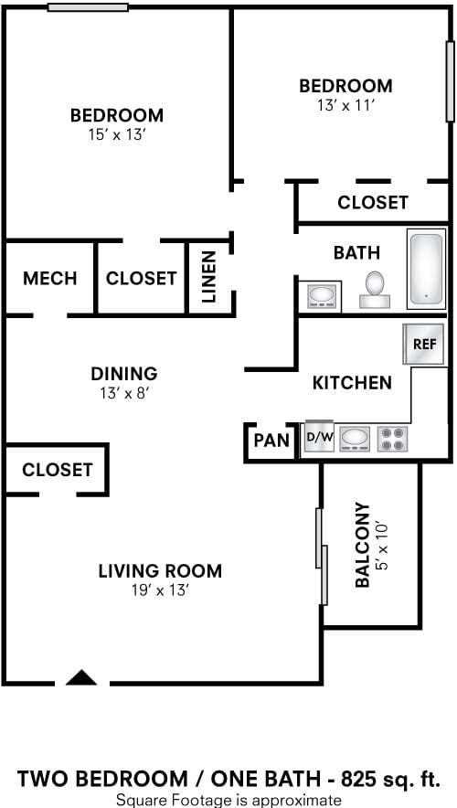 Apartment Model: Two Bedroom - 825 sqftFrom $1,8302 Bedroom, 1 Bath, 825 sq ftAvailable Now![]()