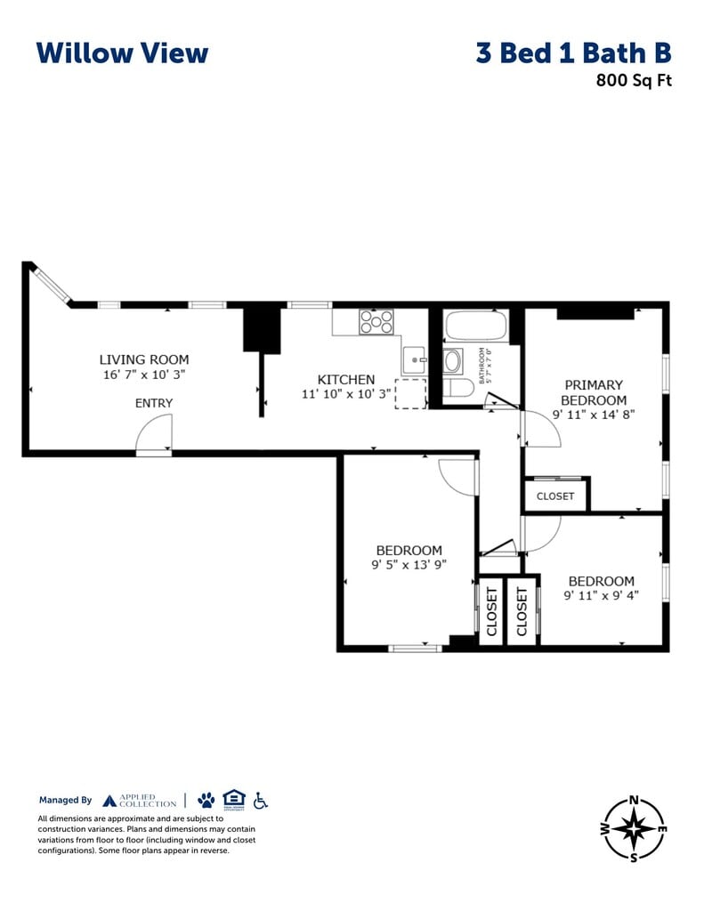 Apartment Model: 3 Bed 1 Bath BCall For Rates3 Bedroom, 1 Bath, 800 sq ftUnavailable![]()