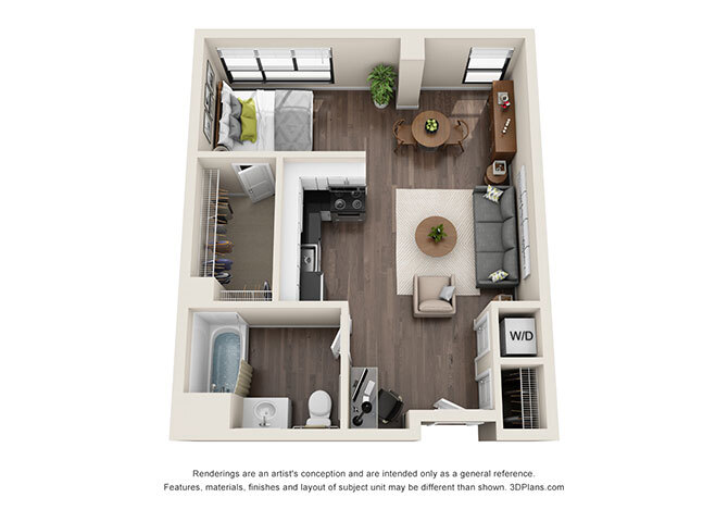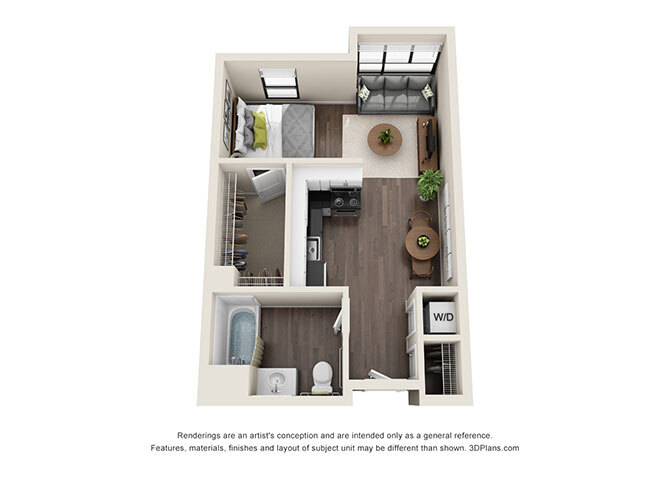 Apartment Model: STUDIO E1.1$2,134Studio, 1 Bath, 496 sq ftAvailable NowFloor plans are artist's rendering. All dimensions are approximate. Actual product and specifications may vary in dimension or detail. Not all features are available in every rental home. Prices and availability are subject to change. Base rent is based on monthly frequency. Additional fees may apply, such as but not limited to package delivery, trash, water, amenities, etc. Deposits vary. Please see a representative for details.