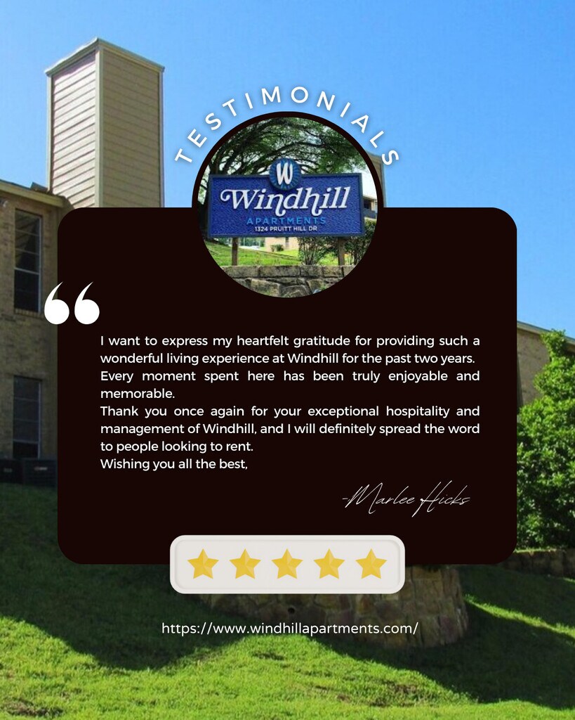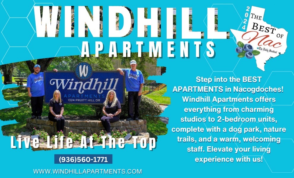 Pre- leasing for June, July, and August! Are you ready to live #lifeatthetop? Located just 1.2 Miles from SFASU, Windhill Apartments offers the finest renting experience in all of Nacogdoches. From a magnificent view of Nacogdoches and SFA, to the loving and family/pet friendly community, to the award winning staff, freshly updated units and 24-hour emergency maintenance, there is no place better than on top with Windhill. Community Features: 1. Walking Distance to SFASU 2. 24-Hour Emergency Maintenance 3. 6, 9 and 12 month leases! 4. Weekly/Monthly Resident Events & Contest 5. Newly Renovated Exterior and Grounds 6. New washateria with card accepting washer/dryers 7. Large pool with Sunbathing Deck and BBQ 8. Picnic and seating areas 9. Extremely Pet Friendly Community with a 1600 SQ FT. Fenced Dog Park & Dog Washing Station 10. Creekside Nature /Walking Trails 11. - The best view in Nac! Interior Features: 1. Updated Paint Color Scheme 2. New Faux Wood/Carpeting/Tile Floors 3. Updated Light fixtures and electrical plugs 4. Private Balconies/Patio 5. Washer/Dryer (included in some units) 6. Fireplace (included in some units) 7. Walk-in Closets 8. Spacious Living/Bedrooms 9. Rent Includes Water/Trash/Sewage Do not respond to this ad, please call the office.