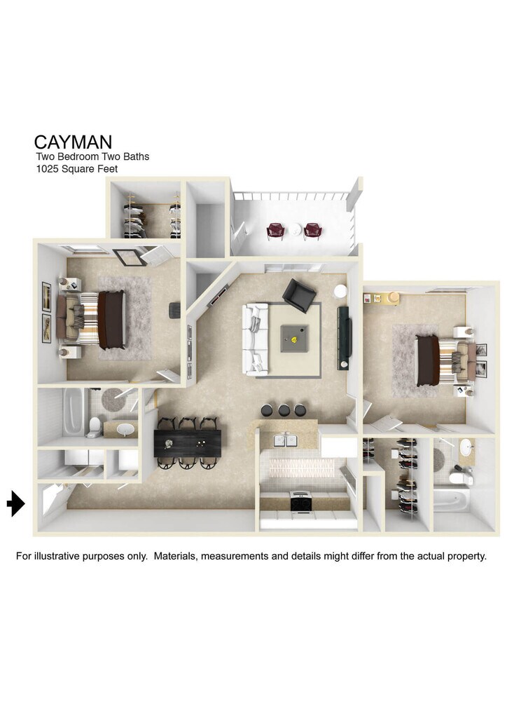 Apartment Model: CaymanFrom $1,0852 Bedroom, 2 Bath, 1025 sq ftAvailable Now![]()