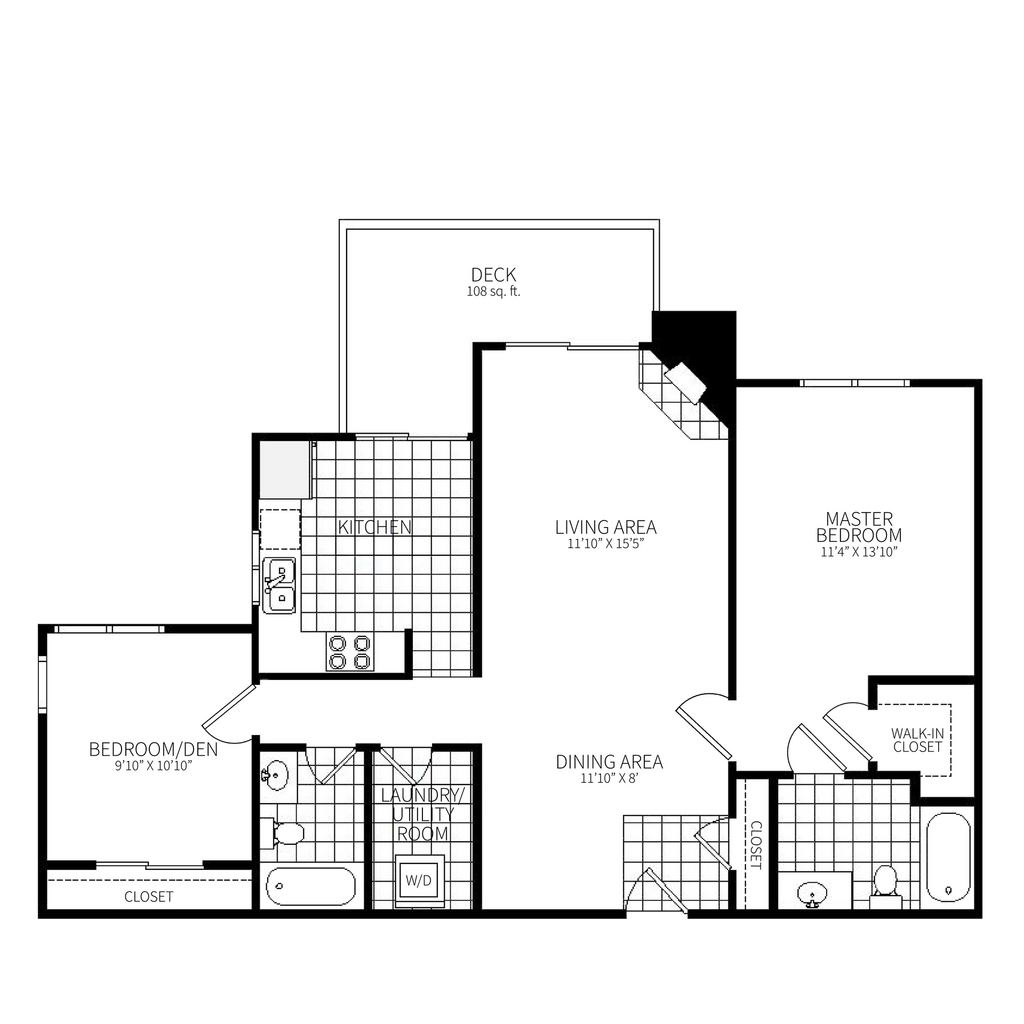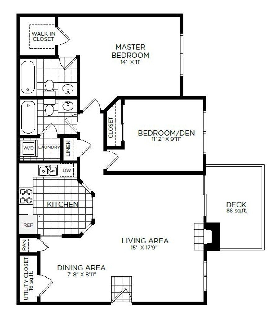 The B1 floorplan is that of a 1,015 square foot two-beds and two-baths apartment. The primary bedroom an adjoining bathroom the secondary bedroom can also be a den. This floorplan features an open-concept living room and dining room area with the deck connected to the living room. The apartment has a pantry, utility closet, and dishwasher. *Please ensure that your anticipated move-in date does not exceed 14 days from the selected apartment's "Available On" date in order to proceed with your application. Additional lease terms may be available. Please contact our leasing team directly for assistance. *Security deposits may vary depending upon qualification.
