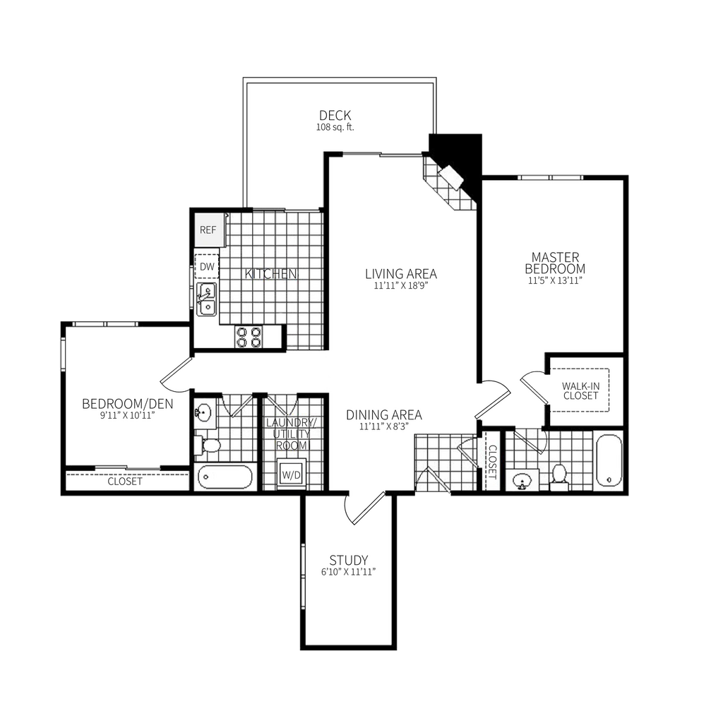 The A1 floorplan is that of a 940 square foot two-beds and one-bath apartment. The primary bedroom has a very spacious walk-in closet. The secondary bedroom can also be a den. This floorplan features a spacious living room and dining room area with the deck joined off one side of the living room. There is an in-apartment washer/dryer, dishwasher and extra closets for more storage space. *Please ensure that your anticipated move-in date does not exceed 14 days from the selected apartment's "Available On" date in order to proceed with your application. Additional lease terms may be available. Please contact our leasing team directly for assistance. *Security deposits may vary depending upon qualification.