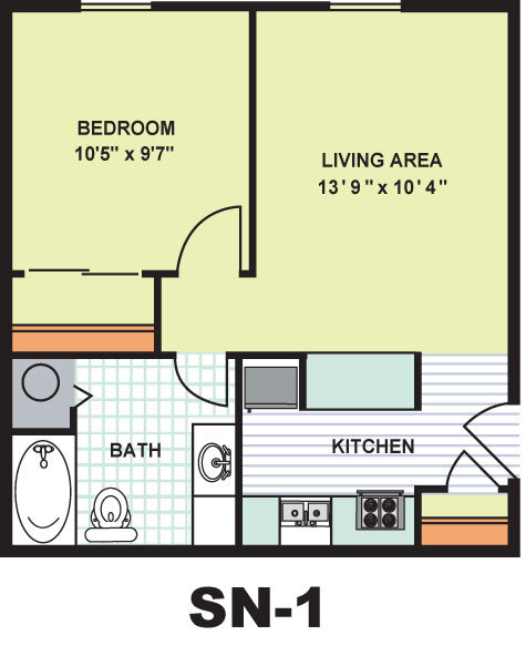 Standard One Bedroom (SN2) - Floorplan 1 Apartment Unit: 251Apartment Model: Standard One Bedroom (SN2)1 Bedroom, 1 Bath, 485 sq ftAvailable NowStandard One Bedroom (SN4M)