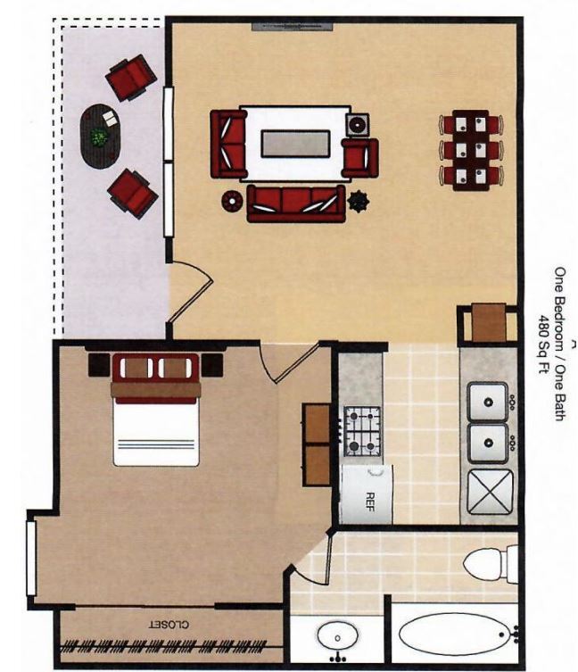 Apartment Model: A1-D 1X1From $9491 Bedroom, 1 Bath, 480 sq ftAvailable Now![]()