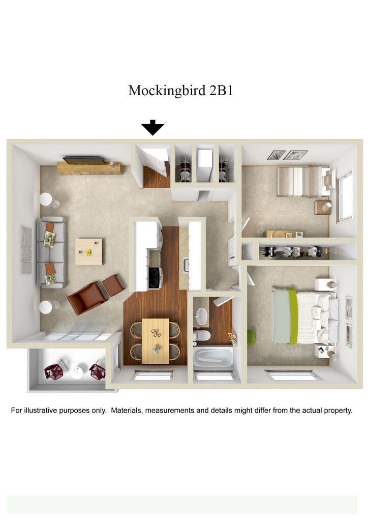 Meadowlark - Floorplan 1 Apartment Unit: 023Apartment Model: Meadowlark$2,5852 Bedroom, 1 Bath, 806 sq ftAvailable NowMockingbird