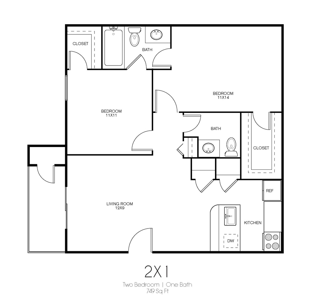 Apartment Model: B1$1,2502 Bedroom, 1.5 Bath, 749 sq ftAvailable Now![]()
