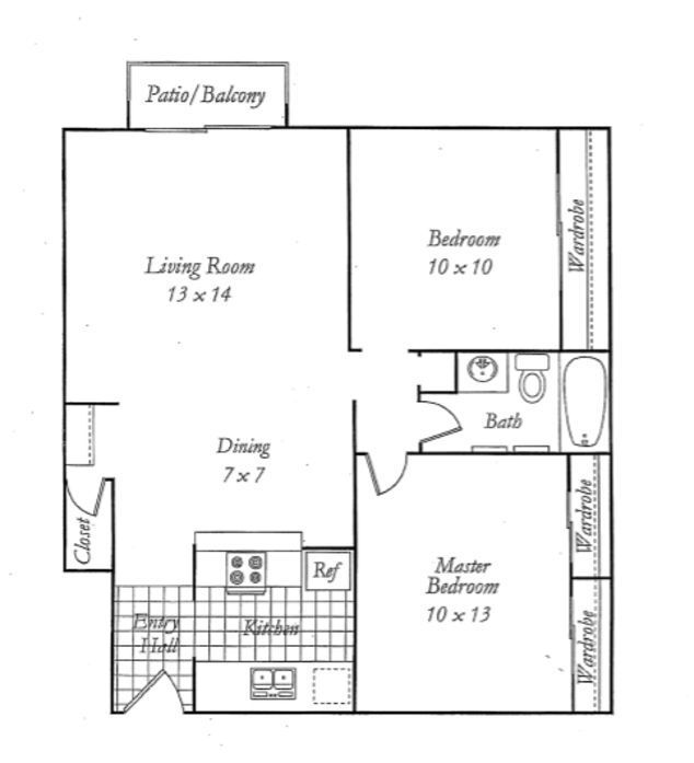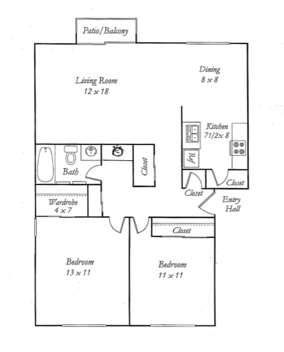 Apartment Model: Pine2 Bedroom, 1 Bath, 840 sq ftUnavailableFloor plans are artist's rendering. All dimensions are approximate. Actual product and specifications may vary in dimension or detail. Not all features are available in every rental home. Prices and availability are subject to change. Base rent is based on monthly frequency. Additional fees may apply, such as but not limited to package delivery, trash, water, amenities, etc. Deposits vary. Please see a representative for details.