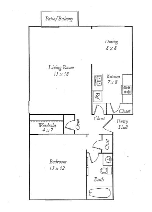 Apartment Model: Oak1 Bedroom, 1 Bath, 690 sq ftUnavailableFloor plans are artist's rendering. All dimensions are approximate. Actual product and specifications may vary in dimension or detail. Not all features are available in every rental home. Prices and availability are subject to change. Base rent is based on monthly frequency. Additional fees may apply, such as but not limited to package delivery, trash, water, amenities, etc. Deposits vary. Please see a representative for details.