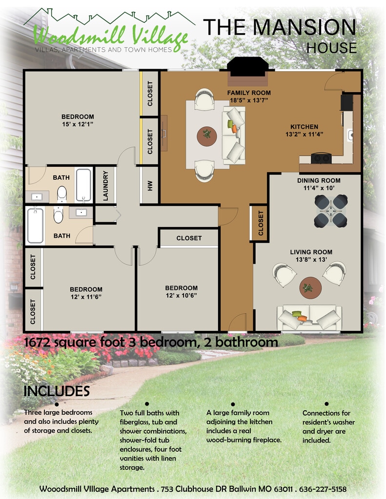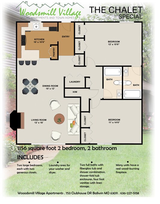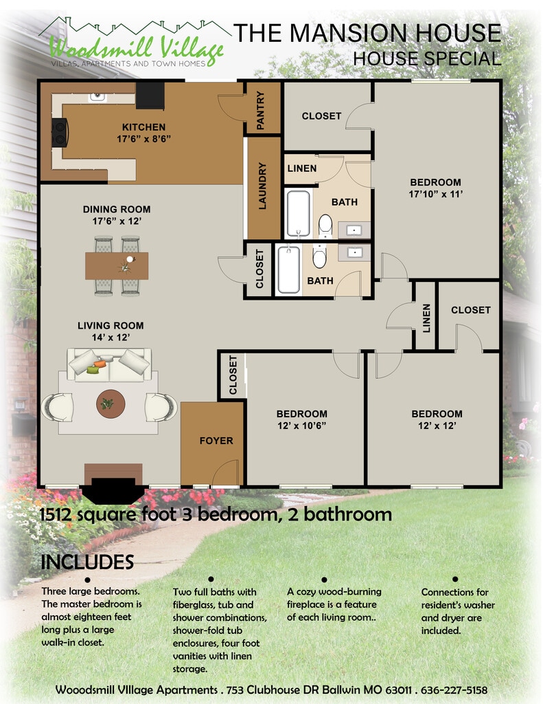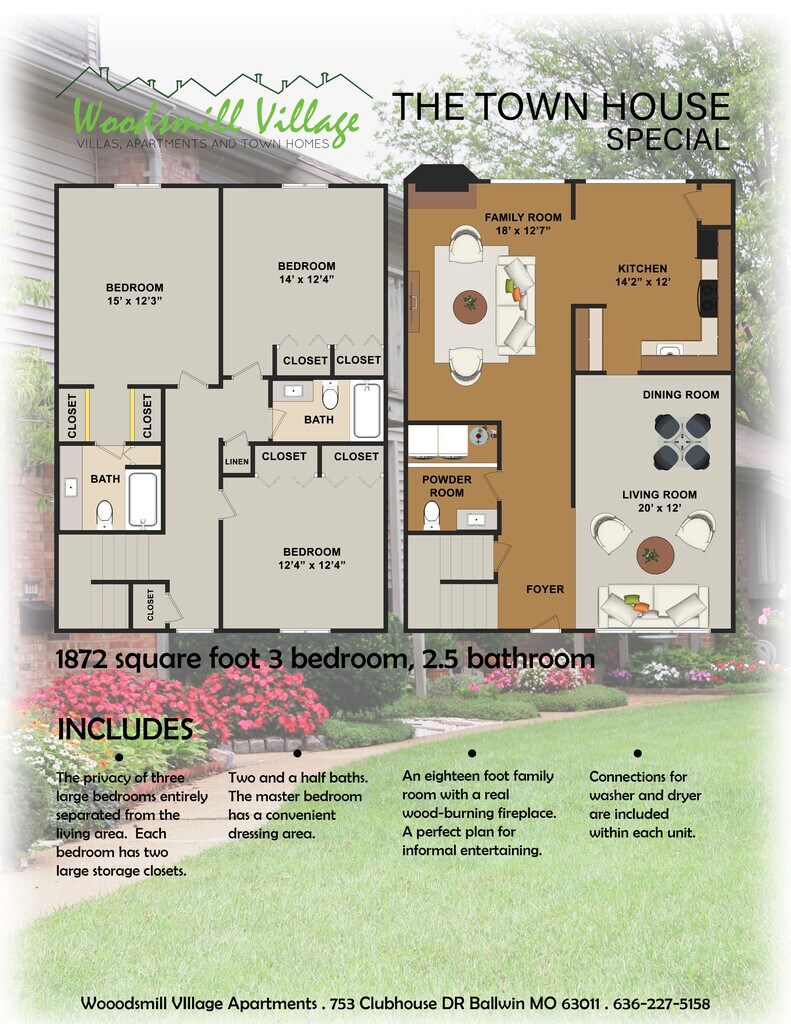 Woodsmill Village Apartment Homes was created for those who know what they want out of life! Our elegant apartments and townhomes of distinction provide carefree living with personalized service including valet trash service, attentive staff and continuing upgrades and updates. You'll be surrounded by 26 acres of natural beauty and vitality. With our central location, you are just minutes from fine dining, shopping and recreation. Rents like an apartment but lives like a home so you'll be living the good life at Woodsmill Village Apartment Homes. Ask about our specials on our 1800+ sq. ft, 3 bedroom townhomes WITH garages!