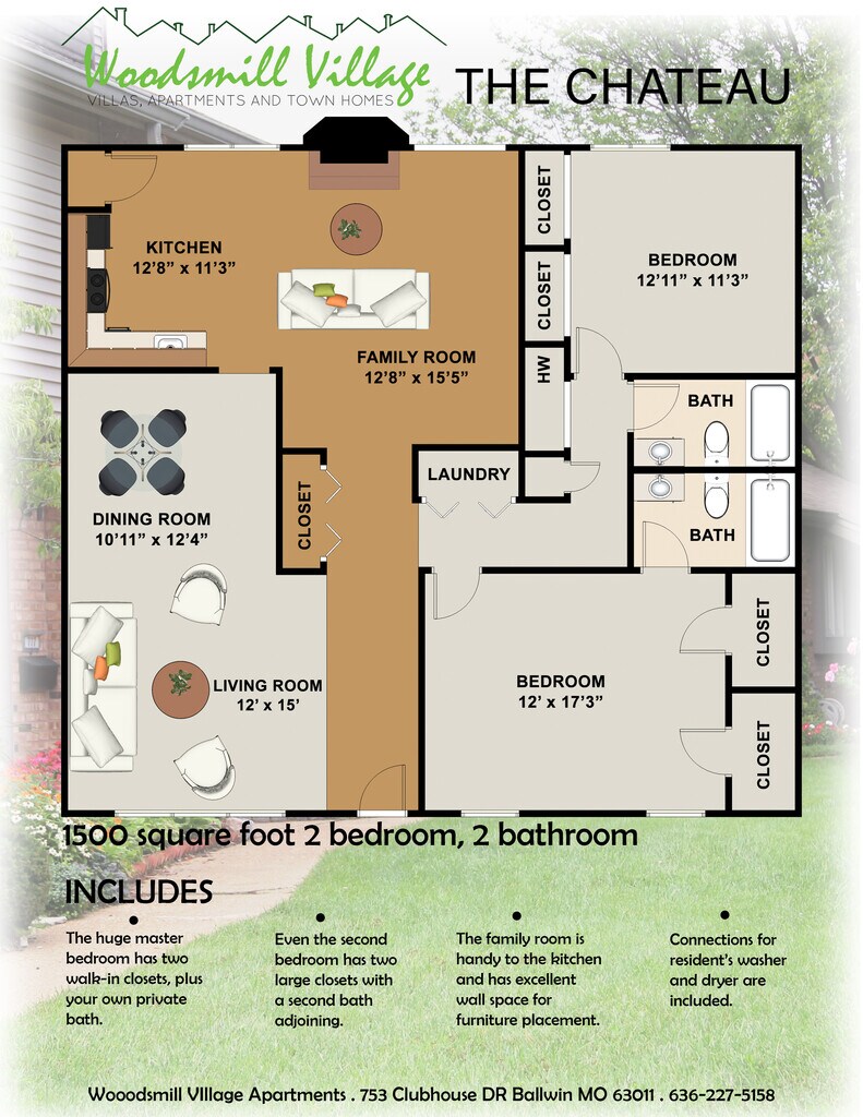 Price Availability Date Unit Sq Ft Deposit $2,170 Call for Availability Chateau Special 1500 sq ft $900 Model Amenities and Features