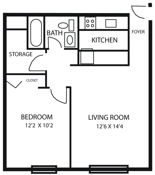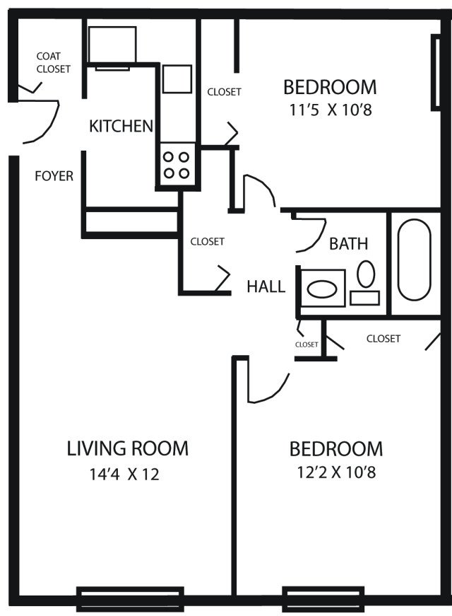 1 Bed, 1 bath - Floorplan 1 2 Bedrooms