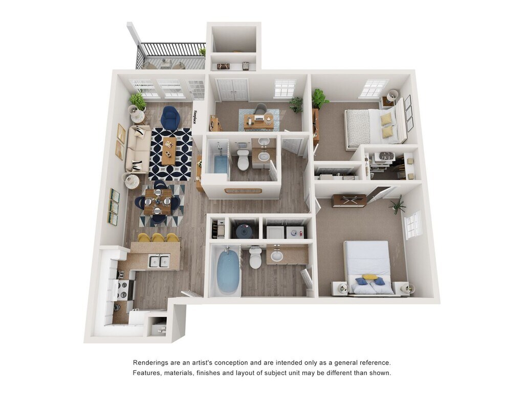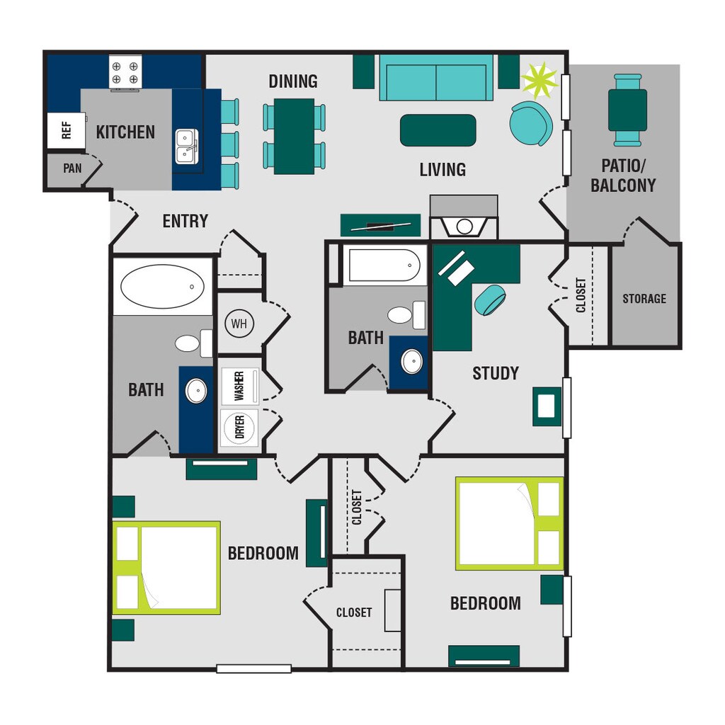 Our three bedroom, two bath floor plan provides ample space with the flexibility of a third room to be used as a bedroom, guest room or study. Each of our stylish apartments guarantees modern fixtures and features, such as a full-size washer and dryer, spacious walk-in closets, luxurious, soaking tubs, a private patio or balcony, and fireplaces.