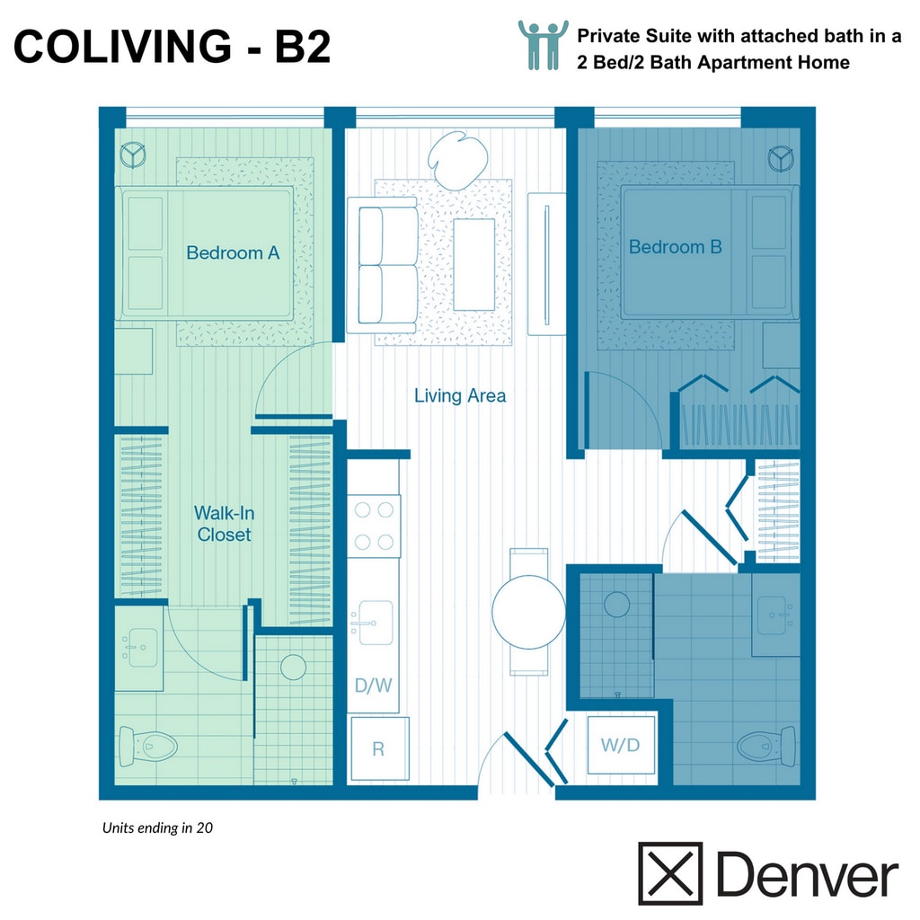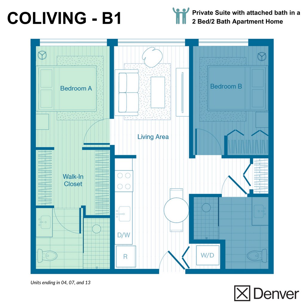 COLIVING Suites in 4 BR/4BA - 1A - Floorplan 6 Apartment Unit: X Denver 1A-1133BApartment Model: COLIVING Suites in 4 BR/4BA - 1AFrom $900Studio, 1 Bath, 292 sq ftAvailable Now![]()