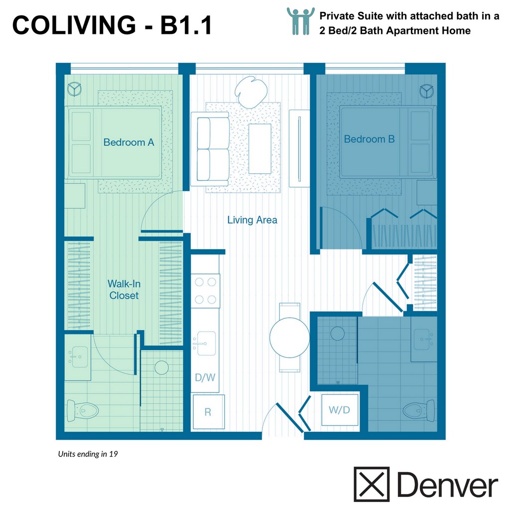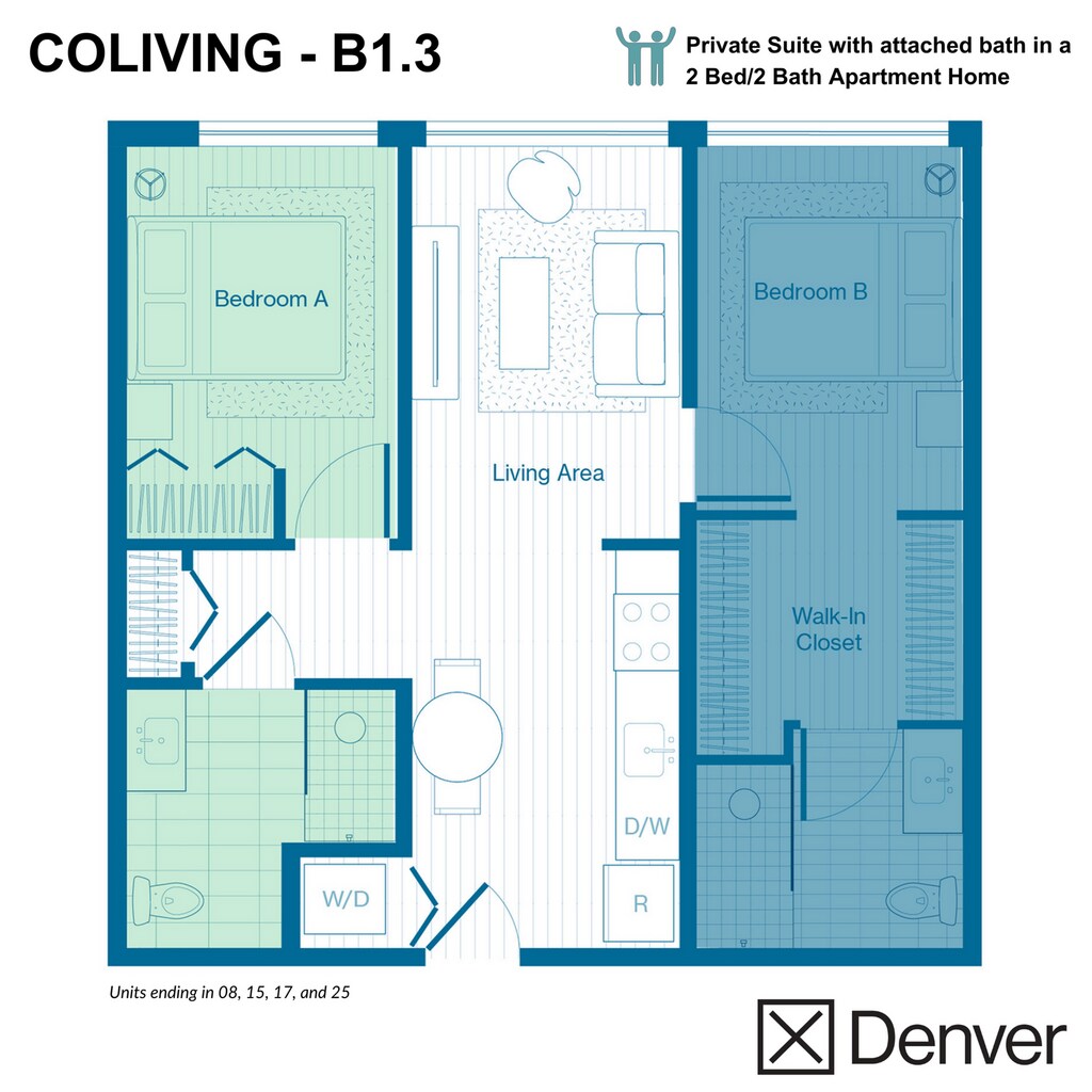 COLIVING Suites in 3 BR/3BA - 1A - Floorplan 4 Apartment Unit: X Denver 1A-318BApartment Model: COLIVING Suites in 3 BR/3BA - 1AFrom $1,000Studio, 1 Bath, 311 sq ftAvailable Now![]()