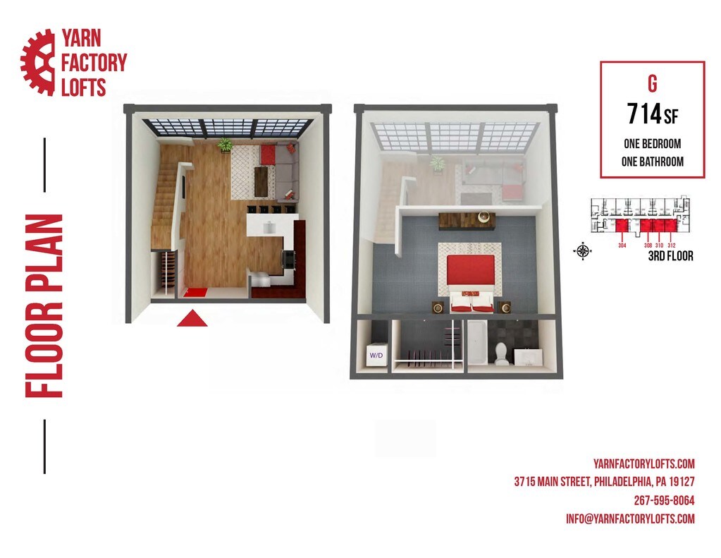 Yarn Factory Lofts offers 1 Bedroom apartments starting from $1,850 and having 714 sq ft. Here is the current pricing and availability: