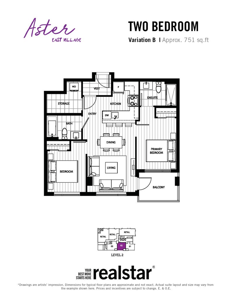 Aster East Village 2 Bed 2 Bath B - Floorplan 2 Apartment Unit: A0102Apartment Model: Aster East Village 2 Bed 2 Bath B$3,0102 Bedroom, 2 Bath, 751 sq ftAvailable February 1, 20263 Bedrooms