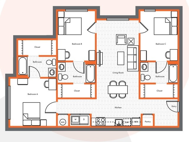 4 Bed, 4 Bath Classic - Floorplan 1 Apartment Unit: Private BedroomApartment Model: 4 Bed, 4 Bath Classic4 Bedroom, 4 Bath, 1699 sq ftAvailable September 18, 20264 Bed, 4 Bath Townhouse