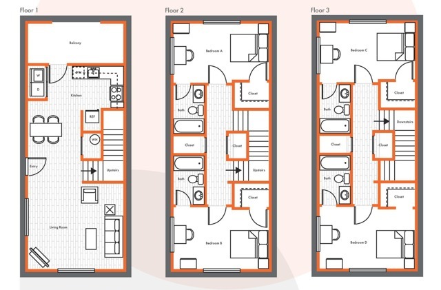 4 Bed, 4 Bath Townhouse - Floorplan 8 Apartment Unit: Private BedroomApartment Model: 4 Bed, 4 Bath Townhouse4 Bedroom, 4 Bath, 1862 sq ftAvailable September 18, 2026