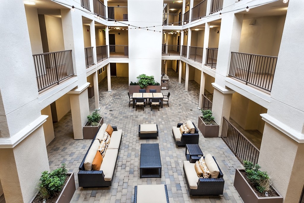 - Landscaped Courtyard with Seating and Ambiance Lighting