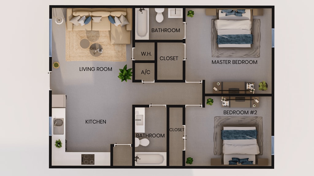 Apartment Model: 2 Bedroom|2 Bath Lg$1,0502 Bedroom, 2 Bath, 928 sq ftUnavailableFloorplansPhotos![]()
