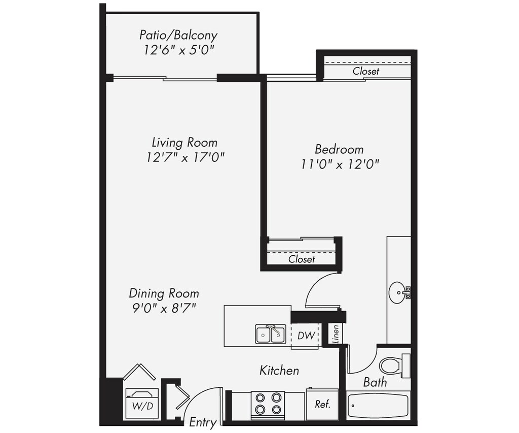 1 Bed, 1 Bath, 755 sq ftAvailable NowLargest 1 BedroomThis is the largest 1 Bedroom at this PropertyModel Gallery