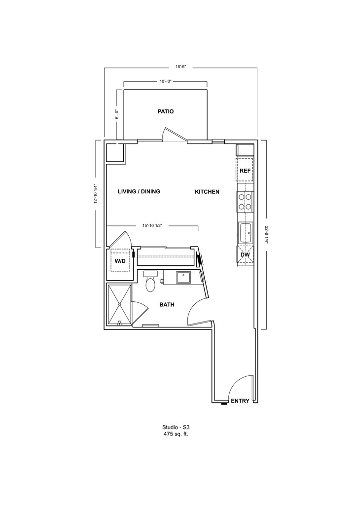 Apartment Model: S3-Floorplan - Balcony/PatioCall For RatesStudio, 1 Bath, 475 sq ftUnavailableFloor plans are artist's rendering. All dimensions are approximate. Actual product and specifications may vary in dimension or detail. Not all features are available in every rental home. Prices and availability are subject to change. Base rent is based on monthly frequency. Additional fees may apply, such as but not limited to package delivery, trash, water, amenities, etc. Deposits vary. Please see a representative for details.