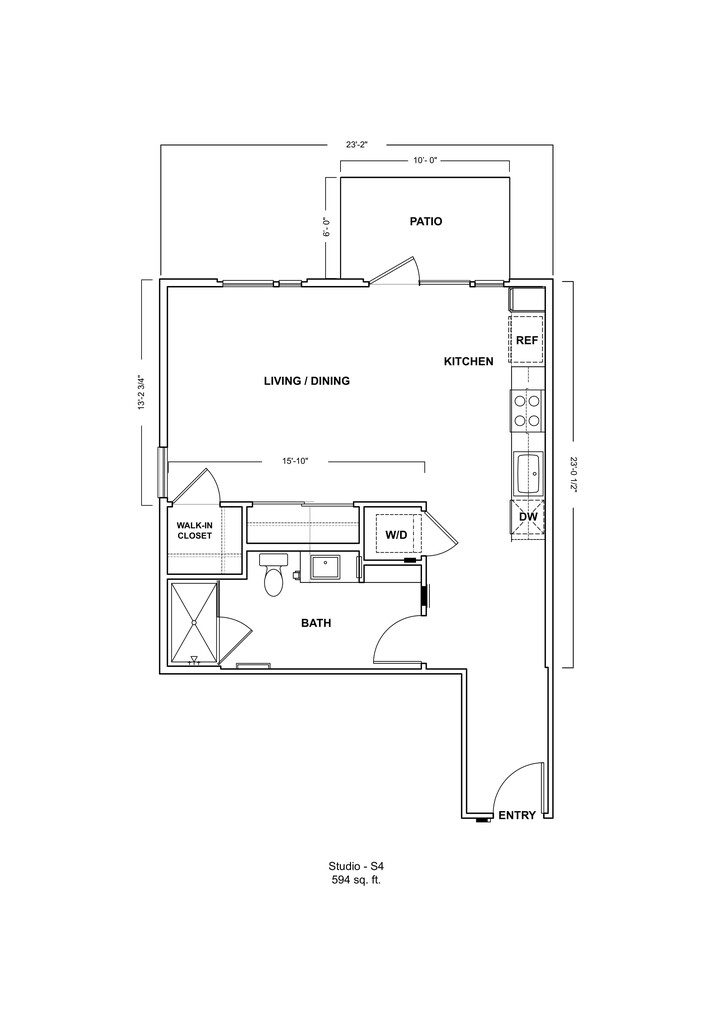 Apartment Model: S4-Floorplan - Balcony/PatioCall For RatesStudio, 1 Bath, 594 sq ftUnavailableFloor plans are artist's rendering. All dimensions are approximate. Actual product and specifications may vary in dimension or detail. Not all features are available in every rental home. Prices and availability are subject to change. Base rent is based on monthly frequency. Additional fees may apply, such as but not limited to package delivery, trash, water, amenities, etc. Deposits vary. Please see a representative for details.