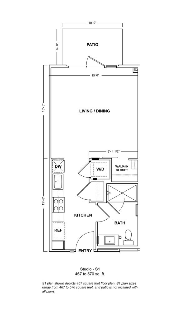 Apartment Model: S1-Floorplan - Balcony/PatioFrom $2,016Studio, 1 Bath, 467 sq ftAvailable December 7, 2025Floor plans are artist's rendering. All dimensions are approximate. Actual product and specifications may vary in dimension or detail. Not all features are available in every rental home. Prices and availability are subject to change. Base rent is based on monthly frequency. Additional fees may apply, such as but not limited to package delivery, trash, water, amenities, etc. Deposits vary. Please see a representative for details.