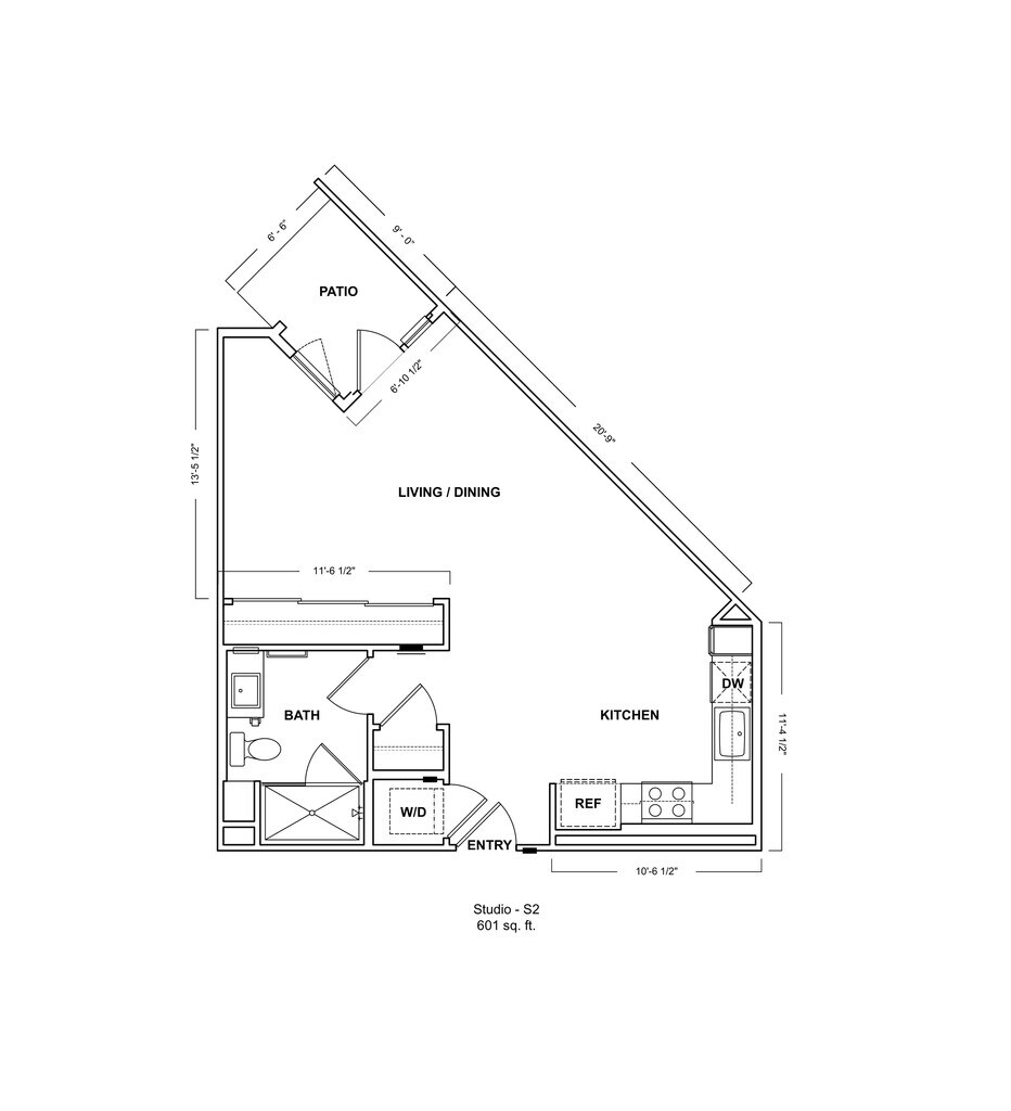 Apartment Model: S2-Floorplan - Balcony/PatioCall For RatesStudio, 1 Bath, 601 sq ftUnavailableFloor plans are artist's rendering. All dimensions are approximate. Actual product and specifications may vary in dimension or detail. Not all features are available in every rental home. Prices and availability are subject to change. Base rent is based on monthly frequency. Additional fees may apply, such as but not limited to package delivery, trash, water, amenities, etc. Deposits vary. Please see a representative for details.