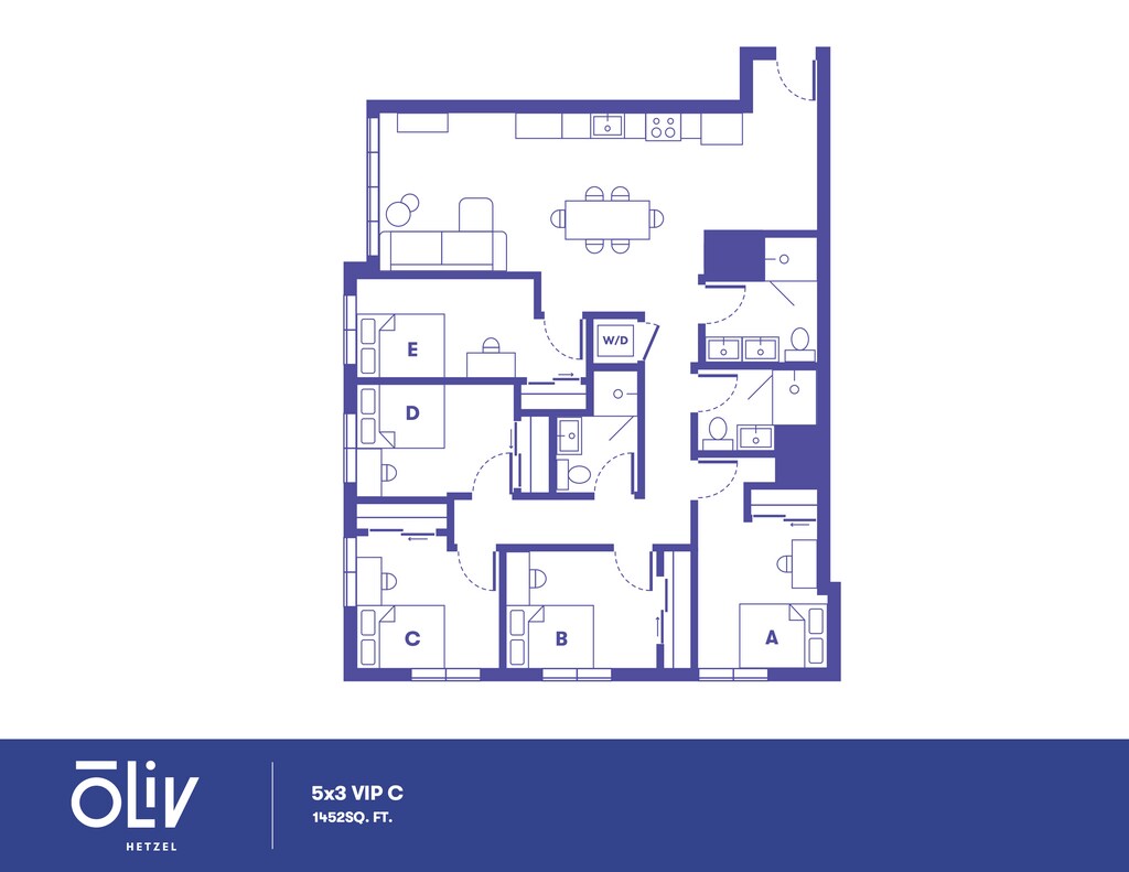 5x3 VIP - Floorplan 3 Apartment Unit: StandardApartment Model: 5x3 VIP$1,7995 Bedroom, 3 Bath, 1277-1452 sq ftAvailable August 20, 20265x3 Lite +