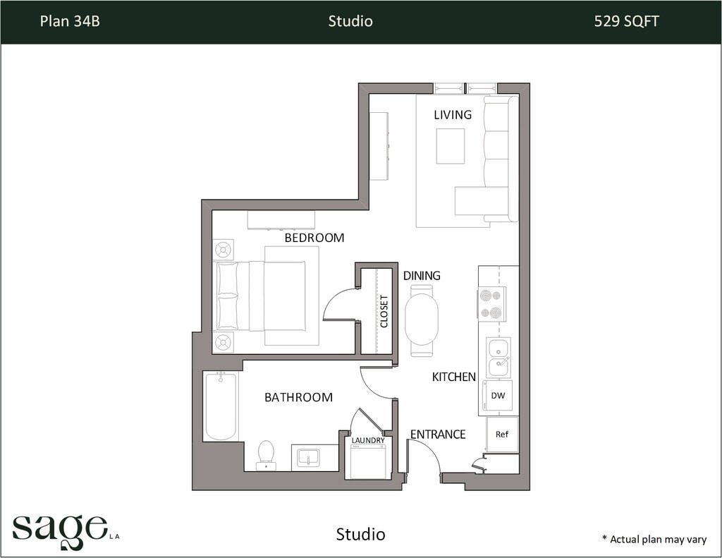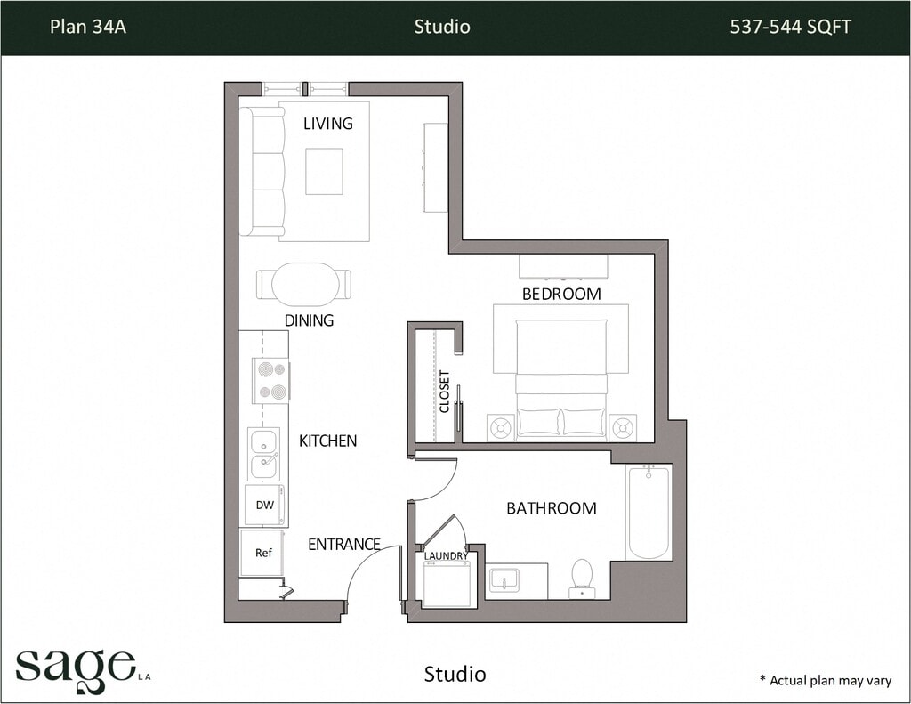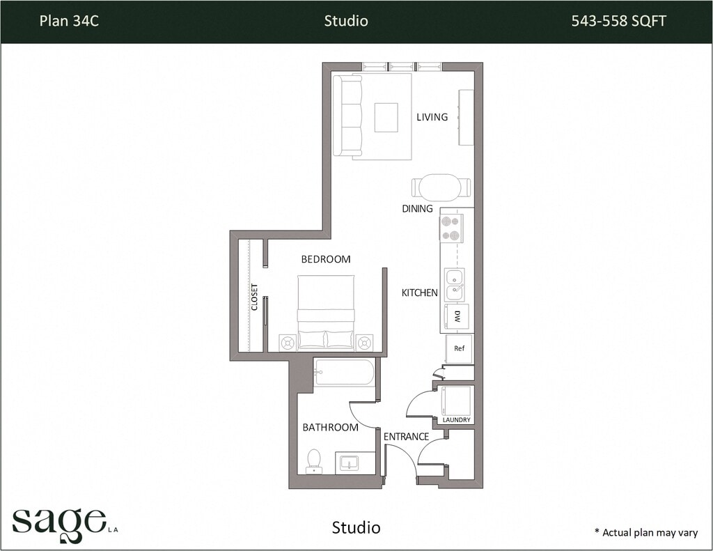 Apartment Model: Studio Plan 34From $2,395Studio, 1 Bath, 534-558 sq ftAvailable Now![]()