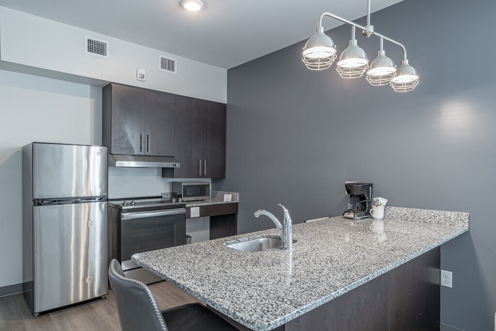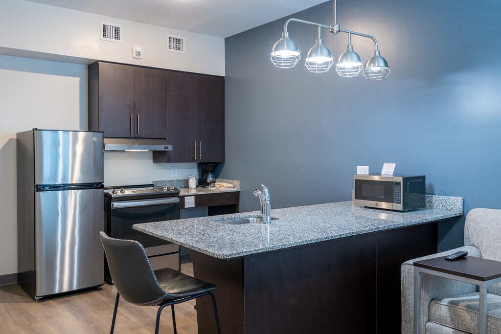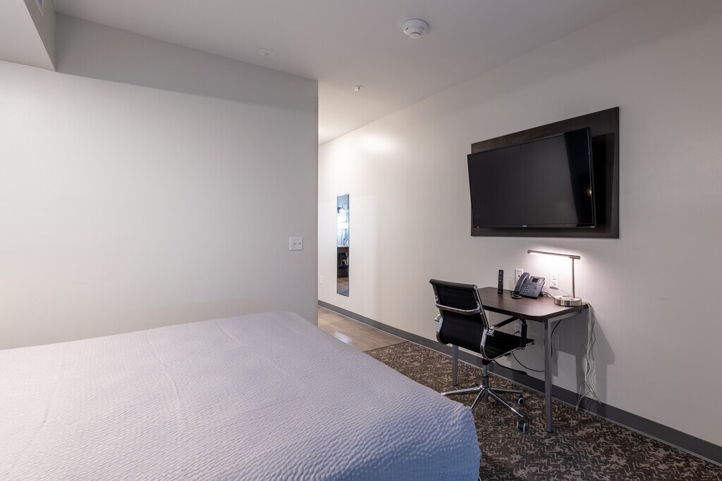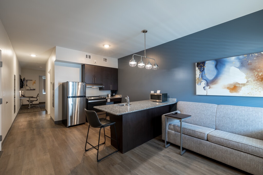 Fully Furnished, FREE Utilities, FREE expanded cable package, FREE Wi-Fi, FREE Parking, Weekly Housekeeping, no lease, no security deposit required. • Fully furnished apartment-style suites • Living Room with 55-inch Smart TV, sleeper sofa and lounge chair • Full-Size Kitchen with full-size appliance (refrigerator, oven, four-burner stove, dishwasher, microwave, coffee maker, dishware, cookware and utensils) • Separate Bedroom with second Smart TV, desk and walk-in closet. • Bathroom • Residents have access to a secure, open-air courtyard with firepit and built-in grill station. • Onsite laundry facility • Onsite Fitness facility • Weekly housekeeping service *Rates and availability are subject to change. Taxes are not included in monthly rate shown. Guests are exempt from occupancy tax after 30-days under local jurisdiction.