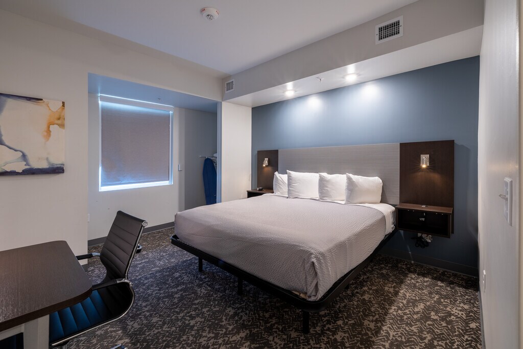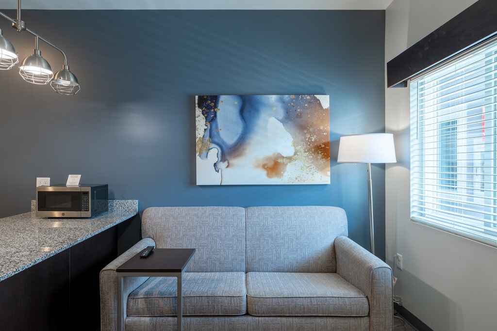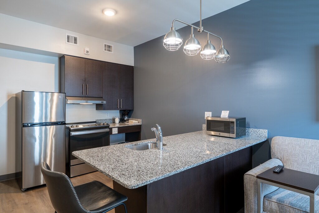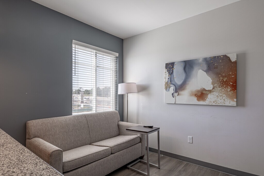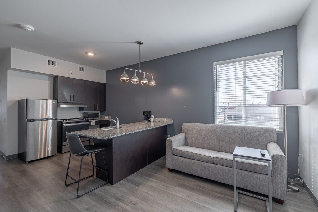 Fully Furnished, FREE Utilities, FREE expanded cable package, FREE Wi-Fi, FREE Parking, Weekly Housekeeping, no lease, no security deposit required. • Fully furnished apartment-style suites • Living Room with 55-inch Smart TV, sleeper sofa and lounge chair • Full-Size Kitchen with full-size appliance (refrigerator, oven, four-burner stove, dishwasher, microwave, coffee maker, dishware, cookware and utensils) • Separate Bedroom with second Smart TV, desk and walk-in closet. • Bathroom • Residents have access to a secure, open-air courtyard with firepit and built-in grill station. • Onsite laundry facility • Onsite Fitness facility • Weekly housekeeping service *Rates and availability are subject to change. Taxes are not included in monthly rate shown. Guests are exempt from occupancy tax after 30-days under local jurisdiction.