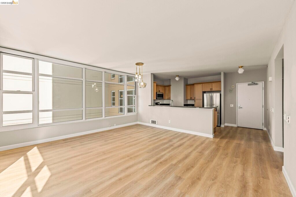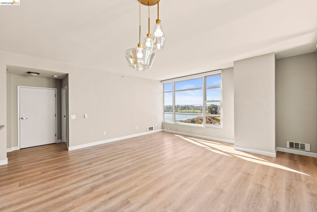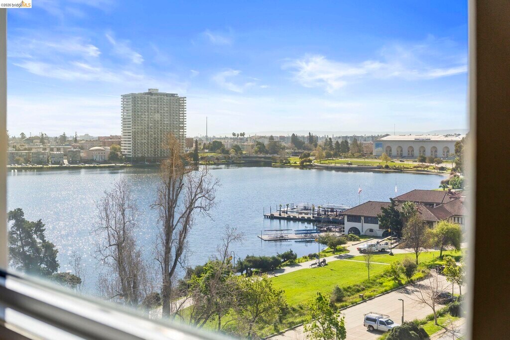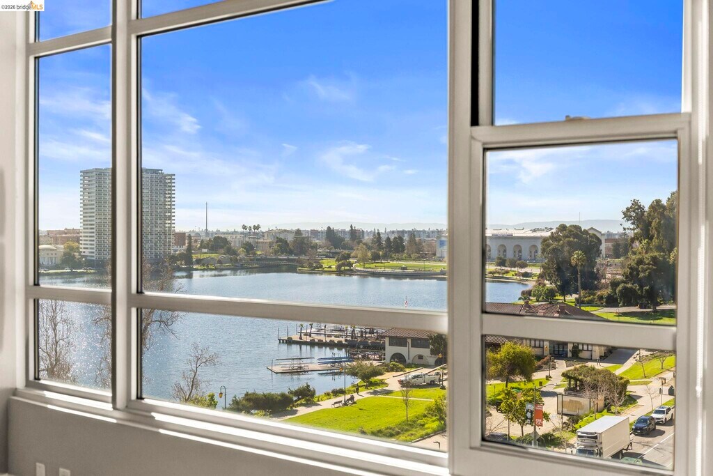 Experience elevated city living in this chic one-bedroom,one-bath condominium perfectly positioned on the shores of Lake Merritt. This light-filled residence captures sweeping views of downtown Oakland and the lake,creating a striking backdrop from sunrise to sunset. The interior has been beautifully refreshed with new paint,brand-new oak kitchen cabinetry,stainless steel appliances,and wide-plank engineered oak flooring,delivering a warm yet modern aesthetic. Updated lighting throughout enhances the clean lines and contemporary finishes,while expansive windows flood the home with natural light. The open living and dining areas provide an effortless flow for everyday living and entertaining,while the spacious bedroom offers a serene retreat with ample room to unwind. One-car parking is included for added convenience. Set within a full-service,luxury building,residents enjoy 24-hour doorman and concierge service,a fully equipped gym,pool,clubhouse,and conference room,offering resort-style amenities in the heart of the city. Just moments from lakeside paths,BART and public transportation,vibrant dining,and cultural attractions,this exceptional condo places you at the center of it all in Oakland! Virtual staging in photos. Unit is not furnished.