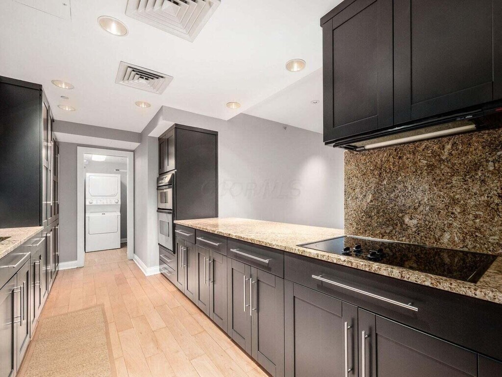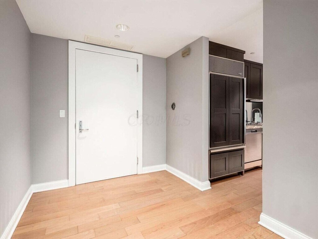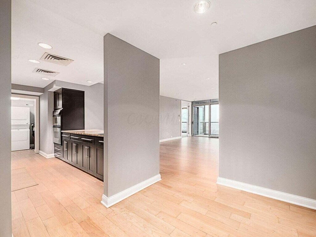 Luxurious 7th floor unit overlooking Columbus skyline with river views,open floor plan,floor to ceiling glass windows,large primary suite,24 ft balcony,refinished wood flooring,and fresh paint throughout. Kitchen has stainless steel appliances,refinished cabinets,and built-in custom bar. Primary suite includes walk-in closet,motorized blinds,brand new carpet,linen closet and jacuzzi tub. Large utility room with washer/dryer and sink. 2 parking spots and additional storage room located in the building. Association dues are included: 24/7 concierge,social rooms,fitness,sauna,steam room,pool and more. Water and gas also included. Tenant pays electric. Minimum Household Income to be 3x rent. Minimum credit score of 625. Applicants must consent to background check.