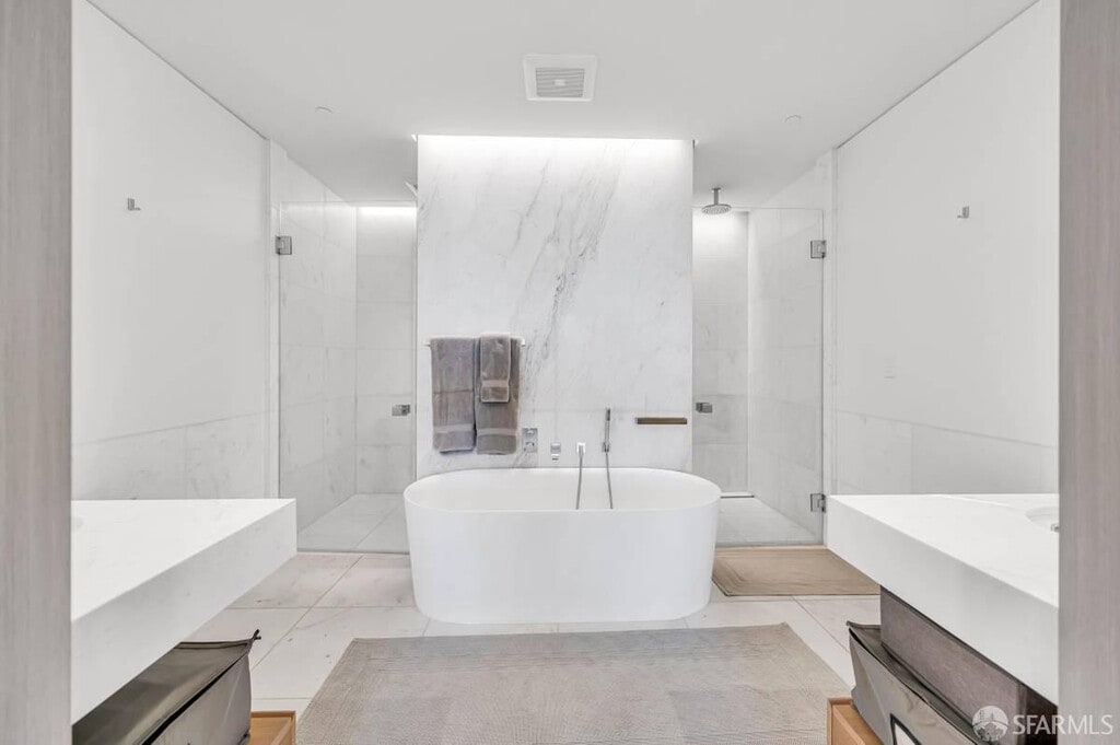 Wrap yourself in the exquisite living experience at One Steuart Lane. This luxurious 2-bedroom, 2-bathroom condominium spans 1,609 square feet, offering a modern and elegant lifestyle amidst the vibrant cityscape. Step inside to discover an open-plan great room, adorned with high end appliances in the chef's kitchen, setting the perfect stage for entertaining. The spacious master suite, complete with a luxurious four-fixture bathroom and walk-in closet, promises restful tranquility. A standout feature of this home is the expansive wrap-around patio, offering breathtaking water and bay bridge views, seamlessly blending indoor and outdoor living. Residents can enjoy a suite of premium amenities including a gym and common rooms conveniently located on the same floor, a serene sauna, and a rejuvenating spa. Experience the ultimate in city living with a 24-hour doorman, valet parking, and a barbecue area that invites relaxation and socializing. A warm space for every member of your family. Indulge in the pinnacle of urban sophistication at this iconic San Francisco building.