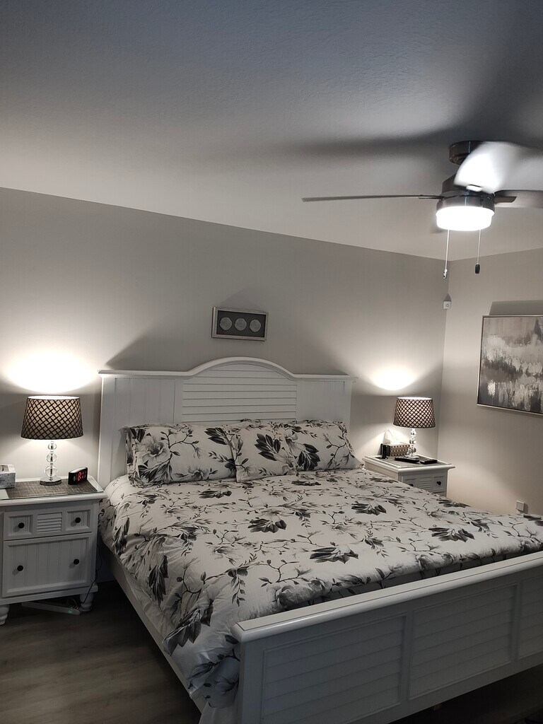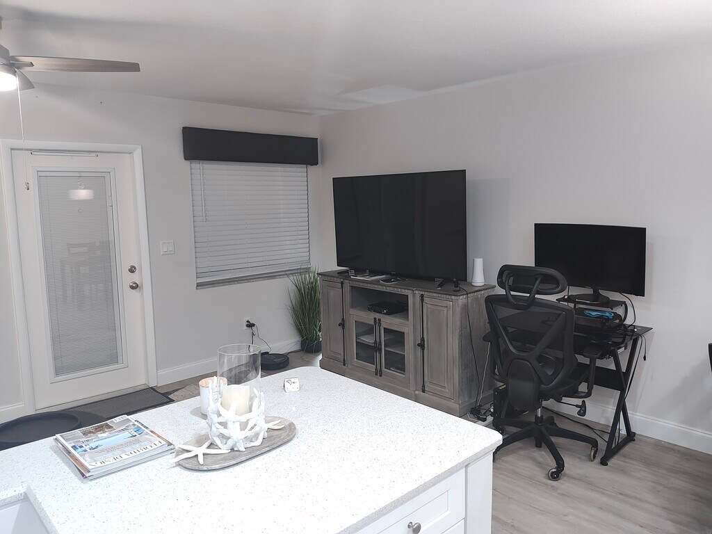 Seasonal Rental Only! This is not an annual rental and comes fully furnished and maintained. This is a non-smoking, no pets unit. This is an age restricted community (55+) Available Dates: October 25 to December 25 2025 $2700 per month 2 month minimum, Also available July 10th to September 10th 2026 $2200.00 per month, two month minimum. Contact owner for requested time period. Also available for the same stated time periods in 2026. FIRST FLOOR 1 bedroom condo has been completely renovated in 2019 including new appliances and freshly furnished and decorated including area carpets wall treatments. Maintained as needed. Assigned parking space plus one reserved space within 10’ of Lanai rear door makes it easy for bringing in your groceries or luggage. Vinyl plank flooring throughout. Tiled bathroom with walk-in shower, barn door glass enclosure. Completely outfitted kitchen with quartz counter tops, including Keurig, toaster, air fryer, smokeless electric grill, quality cookware, dishware and accessories. Living room has queen sleeper sofa, 65” Smart TV at AT&T 200 channel cable. Workspace includes 32” Curved Monitor, glass top desk and ergonomic desk chair, high speed internet. Dining room table for four. Master bedroom with king size bed, 43” Smart TV. Includes convenience items such as iron, ironing board, shark vacuum, robot floor vacuum, luggage racks, fresh linens, pillows and blankets to accommodate king master bed, queen sleeper sofa. Wicker chairs and table on Lanai which includes ceiling fan and Bali sun shades. Includes (2) beach towels, (2) beach chairs and umbrella for the beach and a beach cart and cooler stored in Lanai utility closet. New 2022 clothes washer and dryer in ground floor laundry room just three units away. Building exterior and walkways freshly painted summer 2022. Cable and Internet Included Tenant pays electric. Jan-Feb monthly average $45.00-$65.00 and any movie rentals. THIS IS A NON-SMOKING, NO PETS UNIT. NO SMOKING INCLUDES LANAI AND COMMON AREAS. Vista Royale has over 600 acres of natural Florida woodlands and 6 miles of private roadways for walking or biking. With a 27 hole public golf course running through it, the grounds are beautifully maintained. This age restricted community (55+) offers numerous active clubhouses, heated pools, tennis courts and shuffleboards. All located only a short drive to shops, restaurants and of course Vero’s amazing beaches. With a 27 hole public golf course running through it, the grounds are beautifully maintained. This age restricted community (55+) offers numerous active clubhouses, heated pools, tennis courts and shuffleboards. All located only a short drive to shops, restaurants and of course Vero’s amazing beaches.