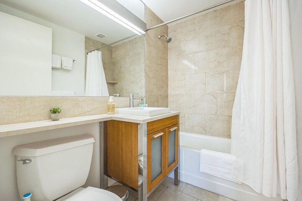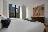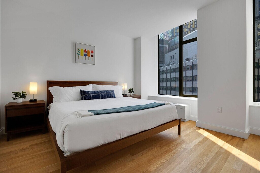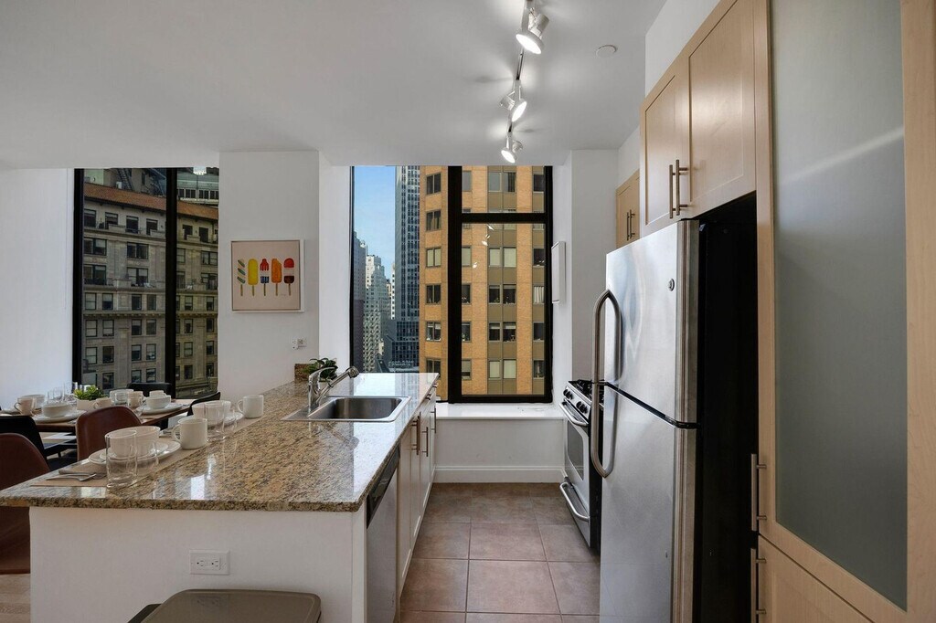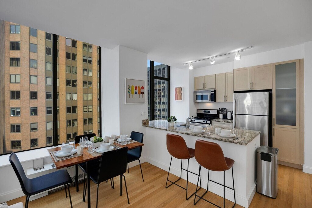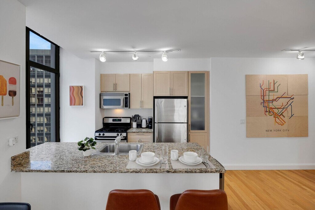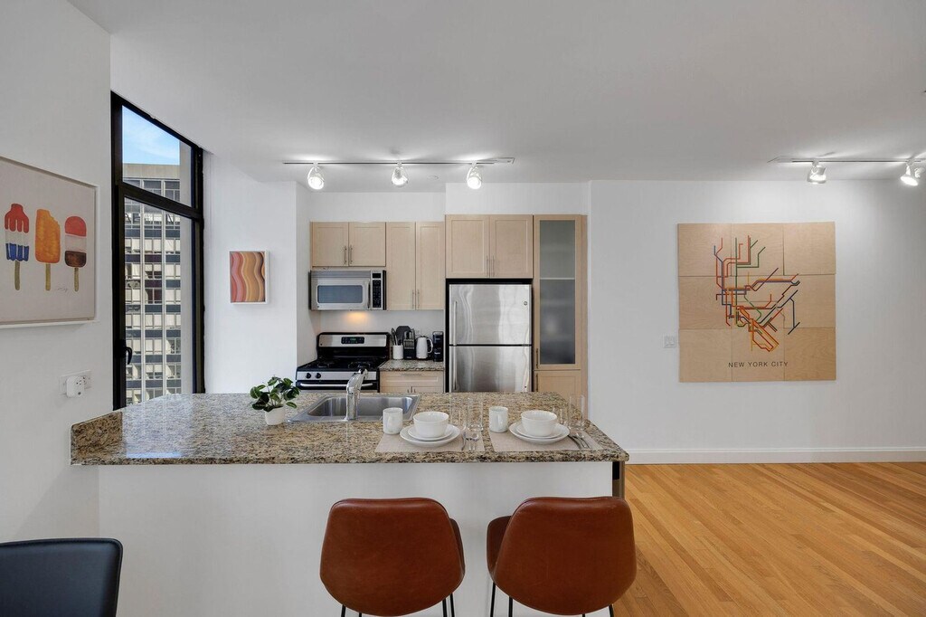 The advertised rate of $4,515/month is the lowest available price, based on a 1 month(s) and 2 day(s) stay with a move-in date of February 28, 2026. Rates vary depending on the duration of stay, season, and other parameters. For exact pricing and additional pricing components, please visit our website and enter your desired move-in and move-out dates. The rate is applicable when billed upfront; it can be higher if billed in multiple payments. Feel at home in this spacious 1-bedroom apartment in the heart of New York City’s Financial District, with the action of Wall Street at your doorstep. Please note that the elevators are being renovated until Spring 2026. This apartment includes a king-size mattress, a full bathroom, a fully equipped kitchen with stainless steel appliances (including dishwasher), a smart TV, and in-unit washer and dryer. The kitchen is stocked with a Keurig coffee machine and pods. Amenities include 2 sets of elevators, a business center and conference rooms, a resident lounge and bar with pool tables, a rooftop sundeck with city views and BBQ grills, and a dry cleaner in the lobby. Special rates are available at the onsite Complete Body Fitness Club. Off-site parking is available nearby. Early check-in from 9am-3pm will incur a fee of $75, early check-in before 9am will incur a fee of 1 full night's rent (based on selected dates), late check-in after 8pm will incur a fee of $50, late check-out from 11am-3pm will incur a fee of $75, and late check-out after 3pm will incur a fee of 1 full night's rent (based on selected dates). Stroll through Battery Park, enjoy a delicious meal by the Seaport, or indulge in high-end shopping at the Brookfield Mall, all within walking distance of your apartment. You'll be steps to the Seaport and riverside promenade, a 4-minute walk to Broad St. Station with the J + Z trains, a 3-minute walk to Wall & William St. and the 2 + 3 trains, a 4-minute walk to the NY Ferry Terminal, a 6-minute walk to Bowling Green Station and the 4 + 5 trains, and a 7-minute walk to Battery Park, Whitehall Terminal, and the Staten Island Ferry. There is a 24-hour Duane Reade across the street and a Starbucks next door. Internet speeds are not guaranteed and may fluctuate based on your computer model and the router location. The A/C runs from May to October, and the heating system works from November to May, and these settings are controlled by the building management. This apartment is specifically designed for remote workers and professionals, featuring an extended desktop and standing desk to optimize your workday. Includes private high-speed internet, an Uplift standing desk, an Uplift work chair, a 34-inch ultra-wide monitor (Samsung), a microphone (Blue Yeti), a webcam (Logitech), computer speakers (Logitech), an LED streaming light, a green screen, a keyboard (Logitech), a mouse (Logitech), a laptop stand, and a TOTU 16-in-1 Triple Display USB-C 3.1 docking station. A laptop computer is not included. [SI]