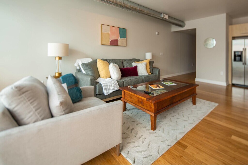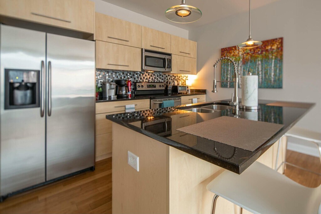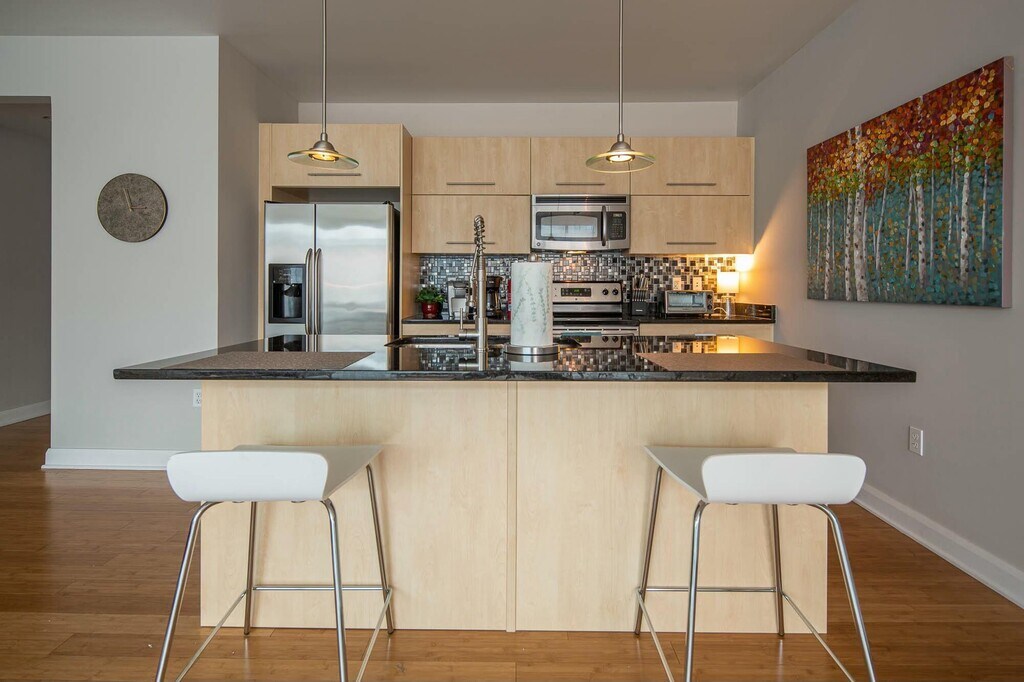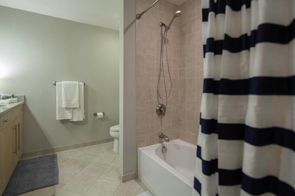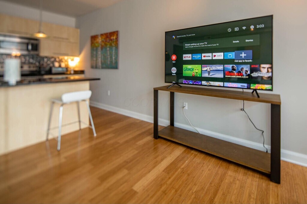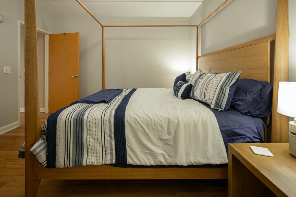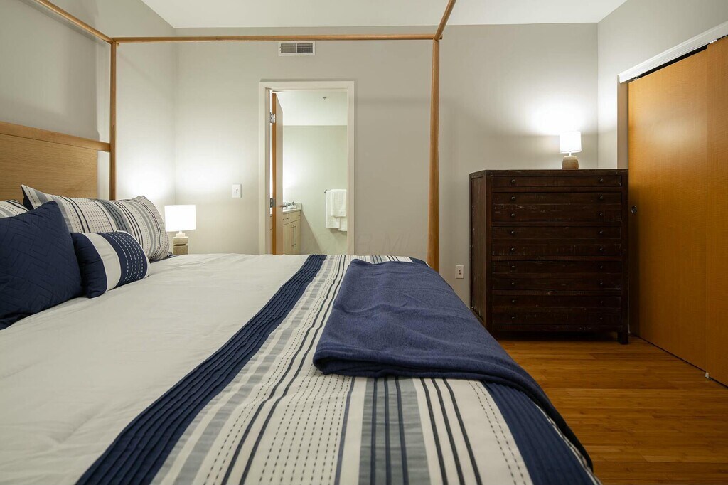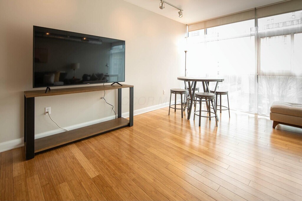 Sleek modern 2br FULLY FURNISHED condo in heart of Downtown Columbus a short walk to everything. Great skyline views from west wall of glass. Real wood floor throughout (no carpet). Open kitchen with island breakfast bar w/black granite,Euro-style cabinets,tile backsplash,abundant lighting,SS appliances. Dramatic gallery foyer hallway. Master bedroom w/spacious owner bathroom has granite & dual sinks. Private guest bedroom & full guest bathroom has walk-in shower & granite vanity. In-unit full-size separate/vented W/D & tankless water heater. Unit includes reserved parking spot in secure underground garage. Building has beautiful lobby & Sky Lounge w/outdoor rooftop patio. Rent includes high-speed internet,water/sewer,trash,and TV service. Tenant pays for electric. No subletting.