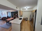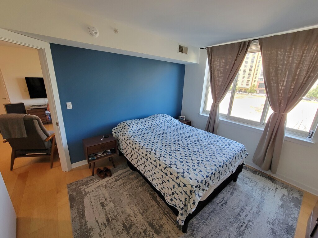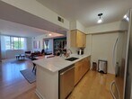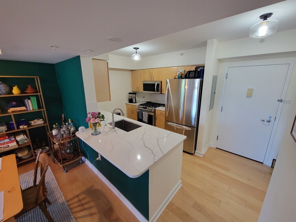 Partially Furnished One Bedroom Apartment with a Balcony Beautifully designed open-concept apartment featuring a warm, modern kitchen and versatile living spaces. The U-shaped kitchen offers light maple cabinetry, sleek granite countertops, and coordinating black appliances, including a gas range and over-the-range microwave. Generous counter space, ideal for both everyday living and entertaining. A wide pass-through over the sink connects the kitchen to the living area, enhancing natural light and effortless conversation. The adjoining living space feels bright and inviting, with large windows, neutral tones, a balcony and room to relax or host guests. A unique built-in desk nook framed by striking stone accent walls provides the perfect work-from-home or study area, blending function with character. Light wood flooring flows throughout, tying the spaces together seamlessly. The bedroom is large with a large walk-in closet and double access to the bathroom. An in-unit washer and dryer complete the comfort. Elegant Capitol Hill Tower building in Navy Yard, with all the amenities you need - 24hr concierge desk, indoor pool, fitness room, pool, community room, business center and free coffee Located less than one block to the Navy Yard (Green Line) Metro, Whole Foods, Nationals Stadium, Capitol Hill and easy access to 1-395 and 1-295. This home offers a thoughtful balance of style, comfort, and versatility—perfect for modern living in a welcoming, well-appointed setting.
