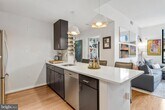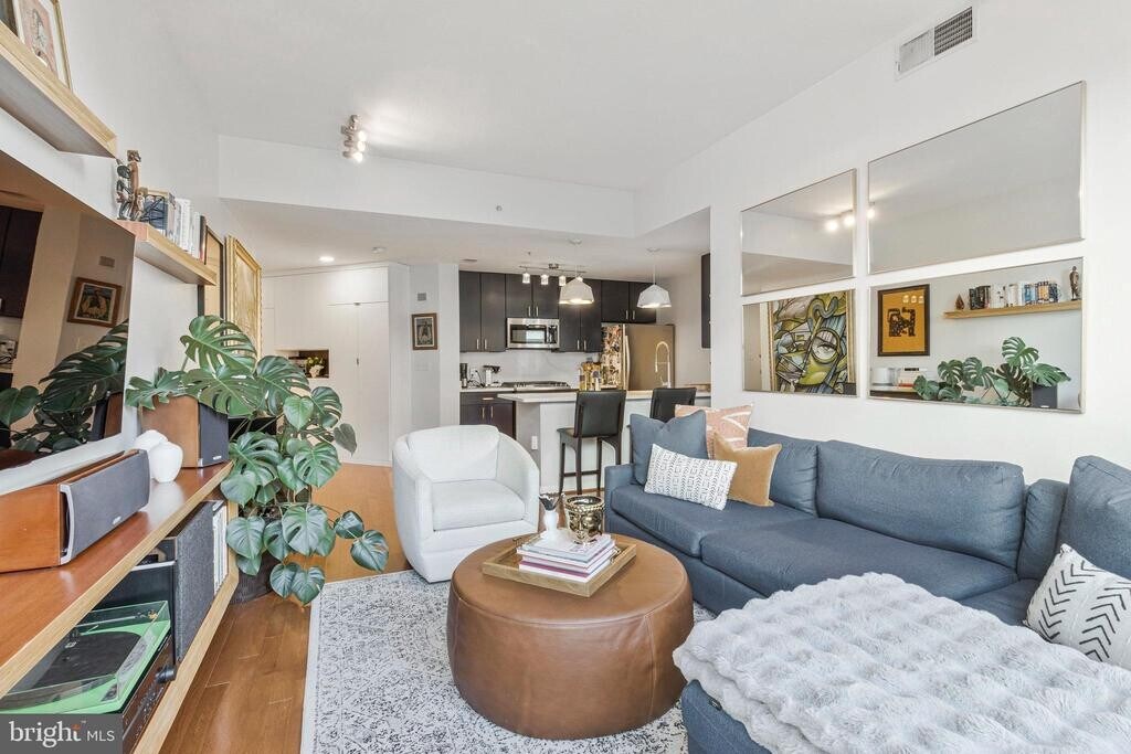 Discover the charm of this sun-drenched, top-floor residence in the heart of Mount Vernon Square, just steps from the iconic Blagden Alley. This thoughtfully designed two-bedroom home features an open-concept layout that seamlessly connects the kitchen and living areas - ideal for both everyday living and entertaining. Soaring 10-foot ceilings, hardwood floors throughout, and a coveted corner exposure flood the space with natural light. The recently updated kitchen is equipped with stainless steel appliances, including a gas range, built-in microwave, and dishwasher, offering both style and functionality. The spacious renovated bathroom features a sleek walk-in shower with a spa-like feel. Thoughtful custom storage has been added in both the front hall and the primary bedroom’s walk-in closet, maximizing organization without sacrificing aesthetics. In-unit laundry includes a stacked washer and dryer conveniently located within the primary walk-in closet. The secondary bedroom is perfectly suited for a guest room or home office and opens to a private balcony, an ideal spot to unwind or enjoy morning coffee. The living area is anchored by a custom-built entertainment center designed specifically for the space, which can convey with the rental for a seamless move-in experience. Building amenities include concierge service, secure electronic access, a package room, and a shared outdoor patio with grills and ample space for hosting. One assigned parking space is included, ensuring easy and reliable access at all times. Tenant is only responsible for electric and internet and a $200 refundable move in fee. This exceptional rental offers comfort, convenience, and a prime urban location—an opportunity not to be missed.