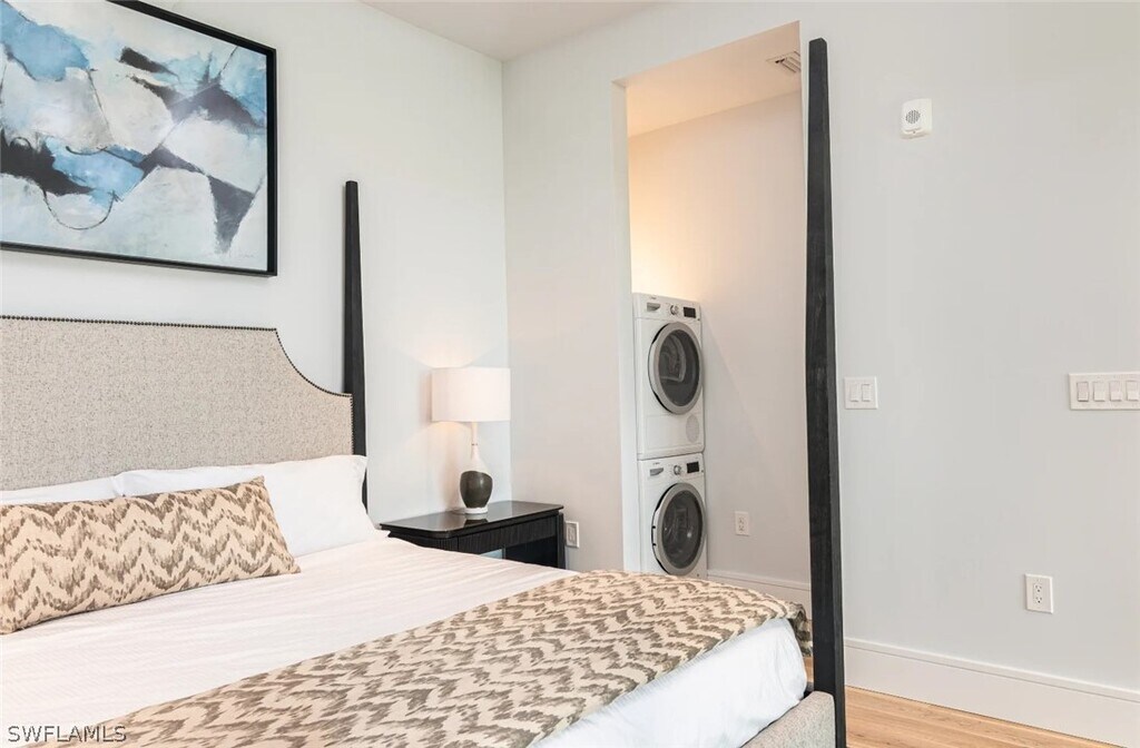 Unit 207 is a 1-bedroom,1-bath luxury condo in Olde Naples. SoCe Flats is an exciting new condominium development in the most desirable neighborhood in Naples,the Paradise Coast's most coveted beach town. "SoCe",named for the ideal location South of Central Avenue in Olde Naples,offers the unique opportunity for a luxurious short-term vacation stay,walking distance to the beach and elegant 5th Ave S shopping and dining district. The building was designed by renowned local architect,MHK,and the interiors are decked out with finishes and furnishings selected by coastal contemporary design experts,Clive Daniel Home. Unit 207 has an open kitchen with sleek white quartz countertops and a counter height breakfast bar. The fully equipped kitchen has cookware,dishes,utensils and serve ware and there is a four seat dining table in case you ever decide to forego the fantastic restaurants within walking distance and eat in! The bedroom has a king size bed made up with crisp white linens and the living room has a sleeper sofa to accommodate a total of four guests. The bathroom is accessible from the living areas and has a full size front load washer and dryer for laundry convenience. There is one assigned covered parking space on the ground floor and additional public parking is available along 8th St S. Note,since this building is zoned for short term rental only,it does not receive USPS mail service and you will not have access to a mailbox during your stay. Onsite,the 18-unit building has a private open air amenity deck on the third floor which features an outdoor grilling area,lounge and dining seating with a TV. While there is no swimming pool or gym on site at SoCe,the Briggs Wellness Center is within walking distance and offers day passes for $12 which provides access to a large gym with cardio equipment and fitness classes,locker rooms with dry sauna and whirlpool,and an outdoor lap pool. SoCe is located along the growing "8th Street Corridor" in Olde Naples just three short blocks from 5th Ave S and eight blocks from beach access at the end of charming 1st Ave S. Many other conveniences are within walking distance such as Wynn's gourmet market and CVS. Designed to offer urban sophistication and amenities within a quaint beach town setting,SoCe Flats is an ideal place to enjoy the increasingly cosmopolitan Naples lifestyle!