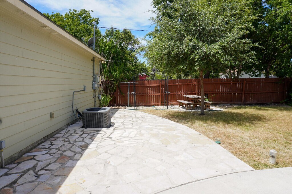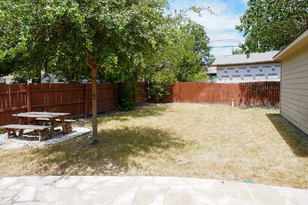 Nestled in the desirable Beacon Hill Subdivision, this stunning one-story modern home is a blend of style and sustainability. Step inside to an open floor plan with high ceilings and abundant natural light. The kitchen is a chef's dream, featuring a newly installed refrigerator, ample cabinet space, and solid countertops, all seamlessly overlooking the inviting living area. The spacious master bedroom is a serene retreat with recessed lighting, a ceiling fan, and an ensuite master bath that includes a single vanity and separate tub and shower. The oversized backyard is perfect for entertaining, complete with a detached garage, a charming flagstone patio, and plenty of driveway space. Conveniently located near Trinity and Incarnate Word University, the Deco District, shopping, dining, and entertainment options. Pets are considered on a case-by-case basis.